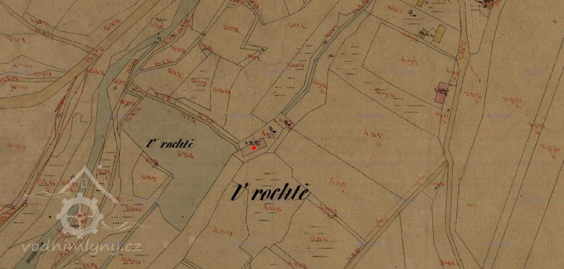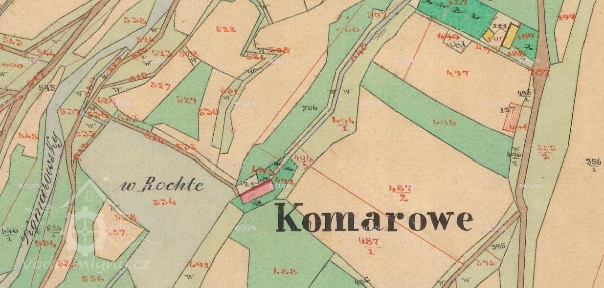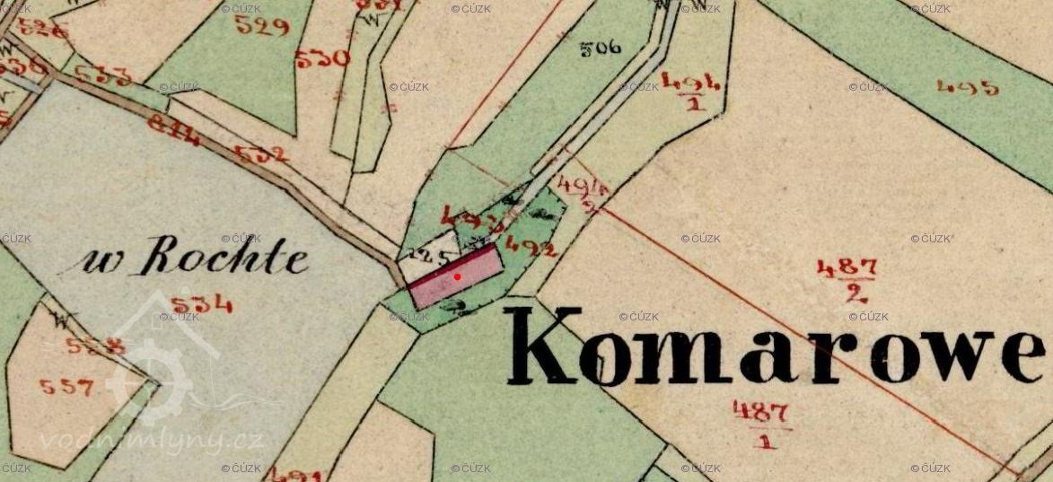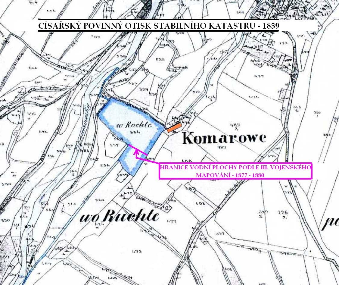 ROK 1550 – 1621: Z historických souvislostí těžby rud a rozvoje železářství v okolí Komárova lze dovodit, že umělá vodní nádrž mlýna, nyní zvaná „dolní“, je částí vodní nádrže původní, která měla jméno Rochta. Založena mohla být mezi rokem 1500 – 1621.