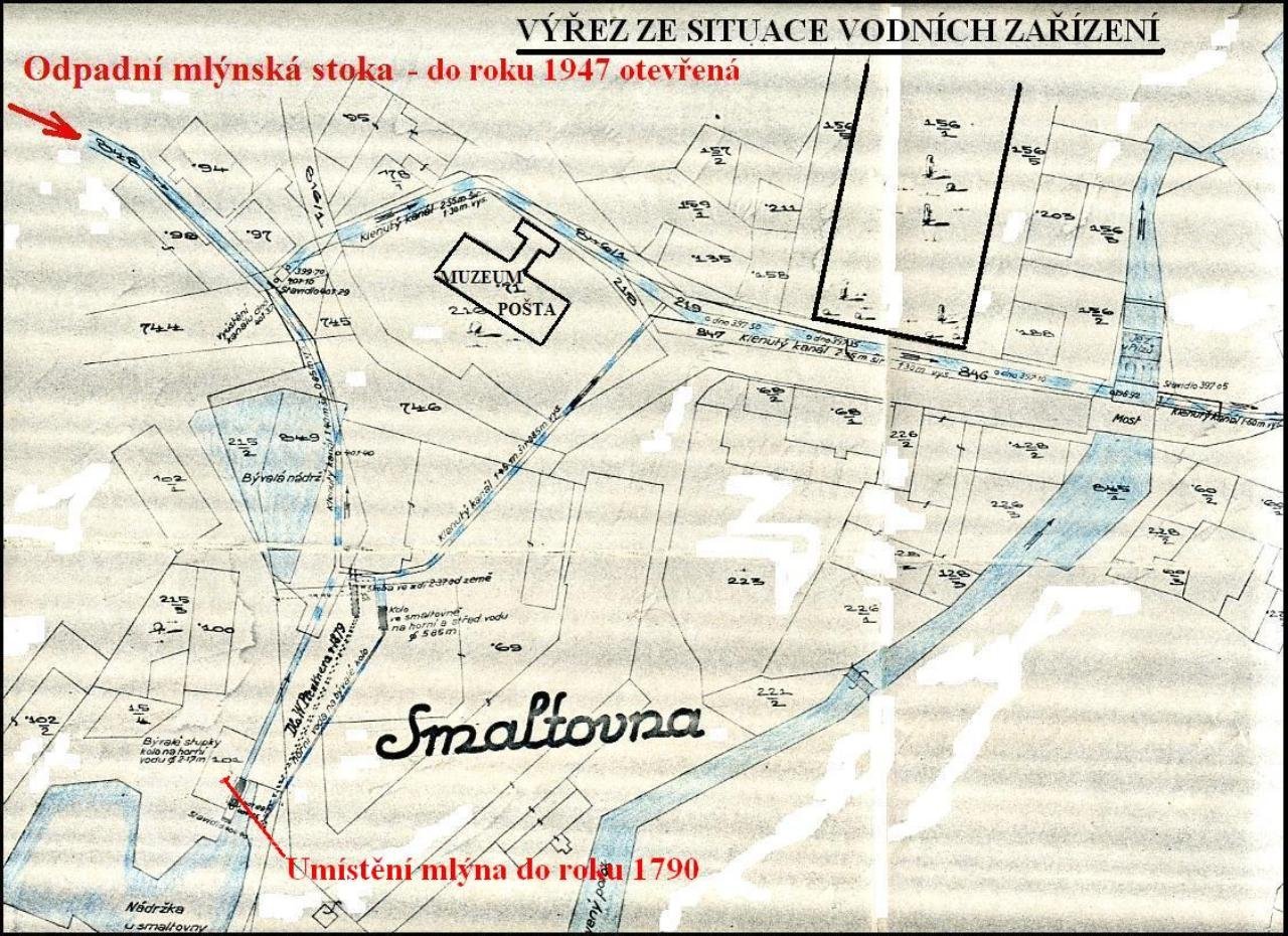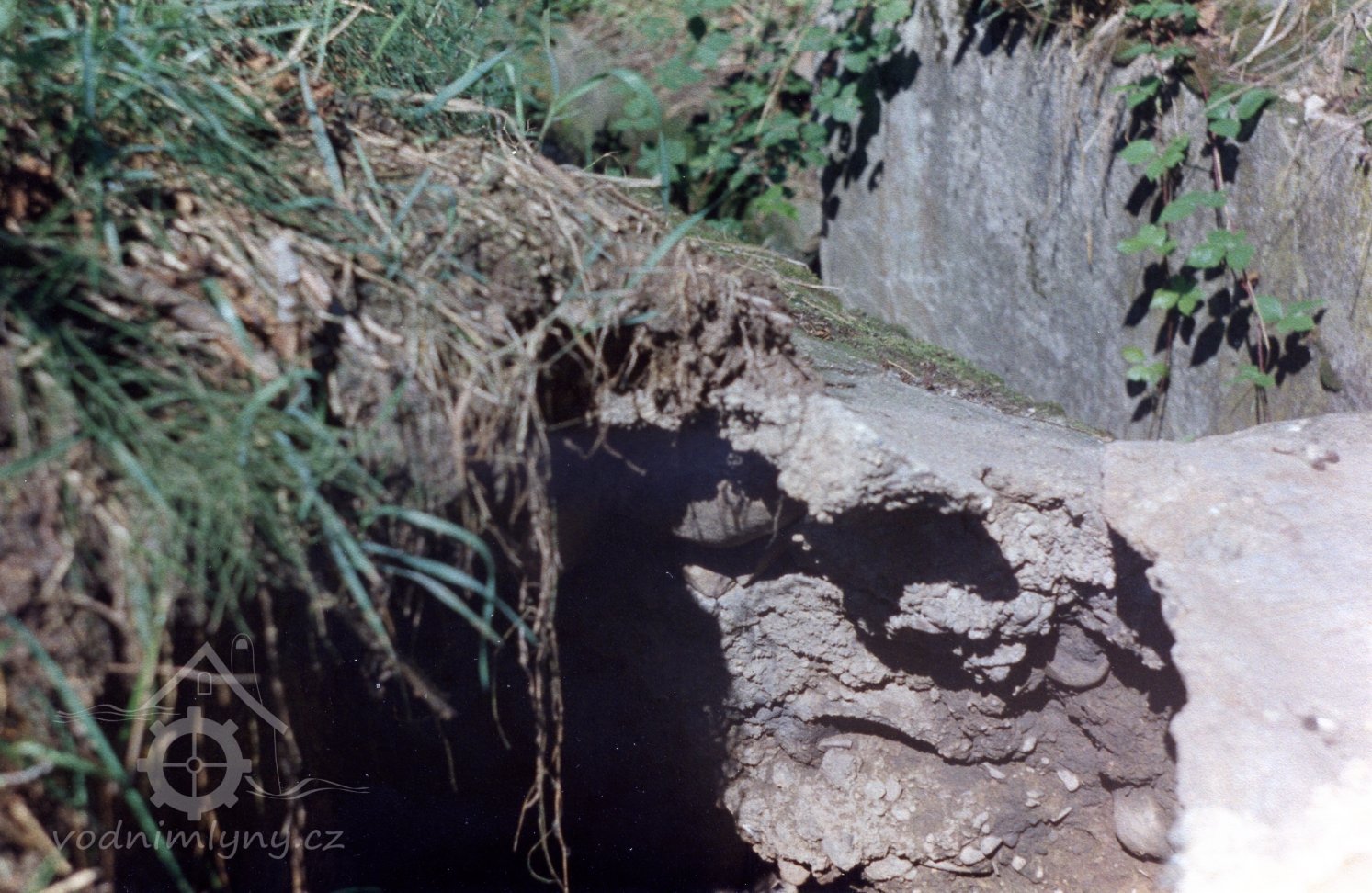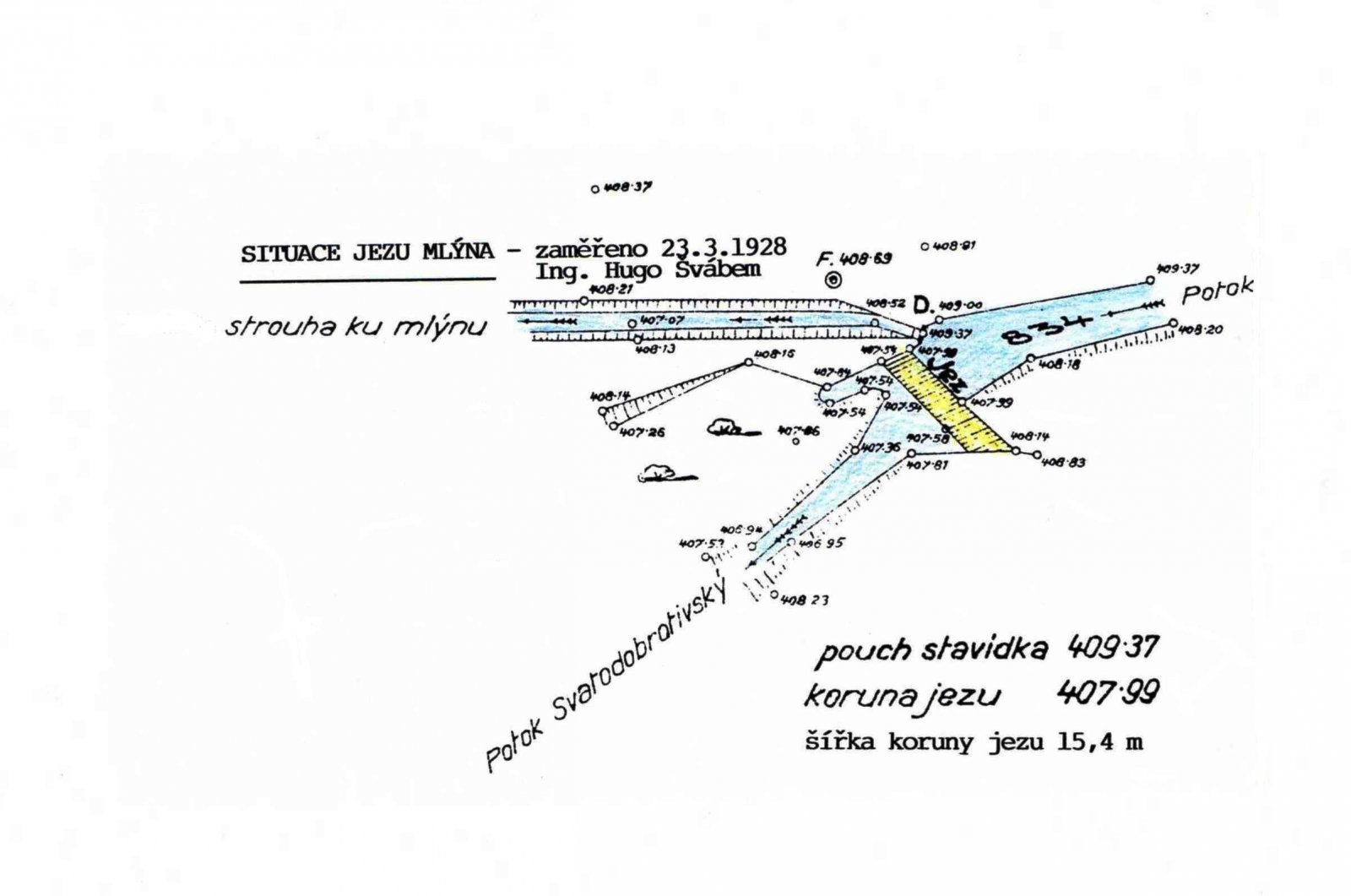 Energeticky nejvhodnější bylo místo v blízkosti areálu dnešního mlýna, na které navazovala druhá odpadní stoka, směřující z pravé části hráze severním směrem. Napovídá tomu i tvar dna nádrže. Tato odpadní stoka, dlouhá přes 300 m, byla vedena přes údolí zpět do toku Jalového potoka, do kterého ústila před místem dnes zvaném V Brodu. (Mapa J. A. Kolbeho z roku 1756 zachycuje doprovodnou vegetaci kolem stoky. Trasa stoky zůstává patrná ještě na katastrální mapě z roku 1839.)
