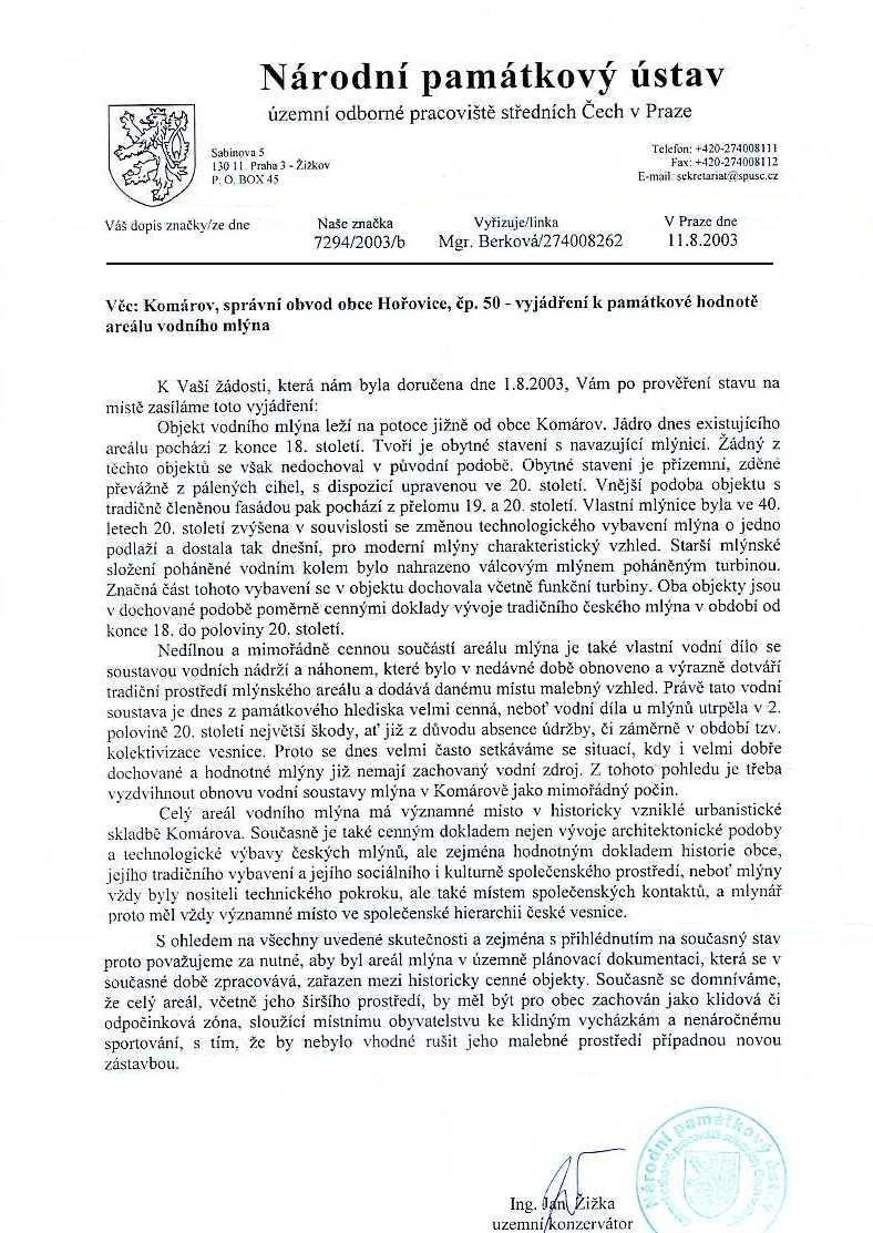 ROK 1601: V dané situaci komárovské panství spolu s doly a hutěmi kupuje významný znalec železářství Jindřich Otta z Losu, provozovatel železné huti Karlovy u Králova Dvora, Staré huti pod Hýskovem a Nové huti pod Nižborem. Intenzivně se zde věnuje rozvoji oboru až do roku 1621, kdy je po nástupu Habsburků, jako jeden z vůdčích představitelů 27 českých odbojných pánů, popraven. Je druhým možným a pravděpodobným zakladatelem vodní nádrže mlýna.