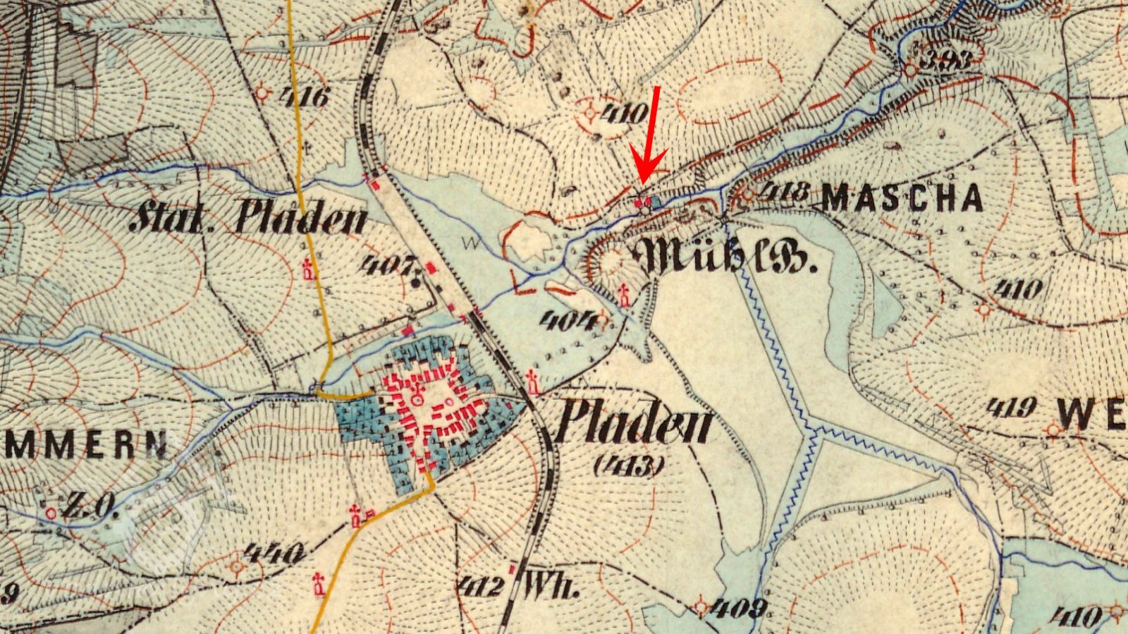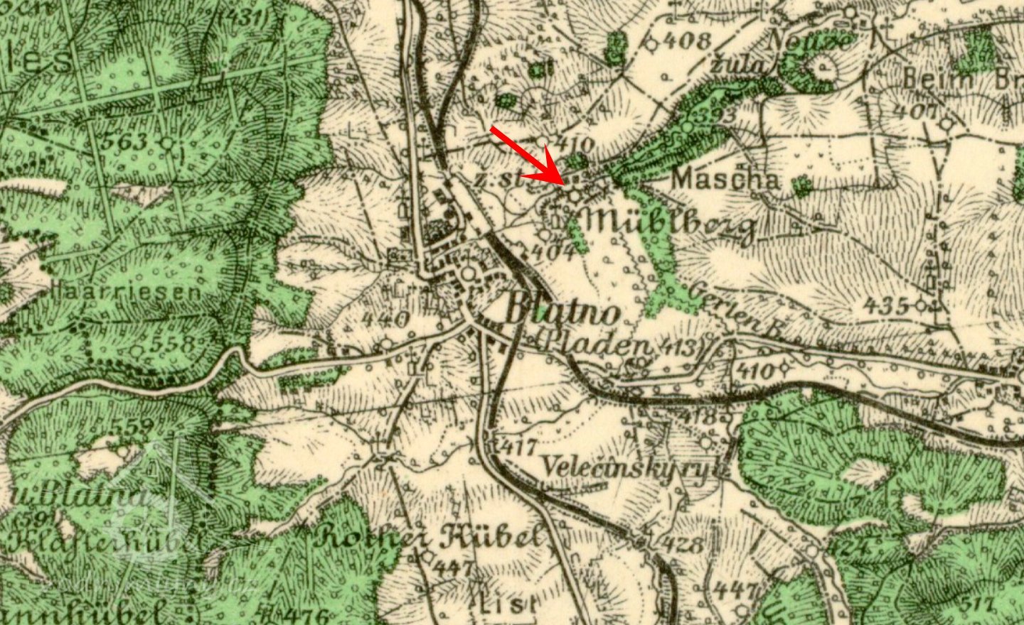 Kronika Blatna, 25. května 1872: „Voda v blatenském rybníku dosahovala až ke svahu stavěné železniční trati, tedy až k vesnici. Ve zbývající hrázi velkého rybníka u takzvaného hlubokého příkopu protrhla voda stavidlo. Stavidlo blatenského mlýna včetně žlabu, kolny a stodoly odnesla voda. Ve mlýně dosahovala voda až po strop místností v přízemí. Mlynářův dobytek se podařilo zachránit jen proražením zadní zdi stáje, takže dobytek mohl utéci dírou na příkře stoupající pozemky.