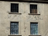 Zemské znaky nad sdruženým oknem, 2013, © Pavel Vychodil, (Prvky na obrázku: plastická omítková výzdoba fasád a štítů, umělecké prvky (sochy, malby, reliéfy))
