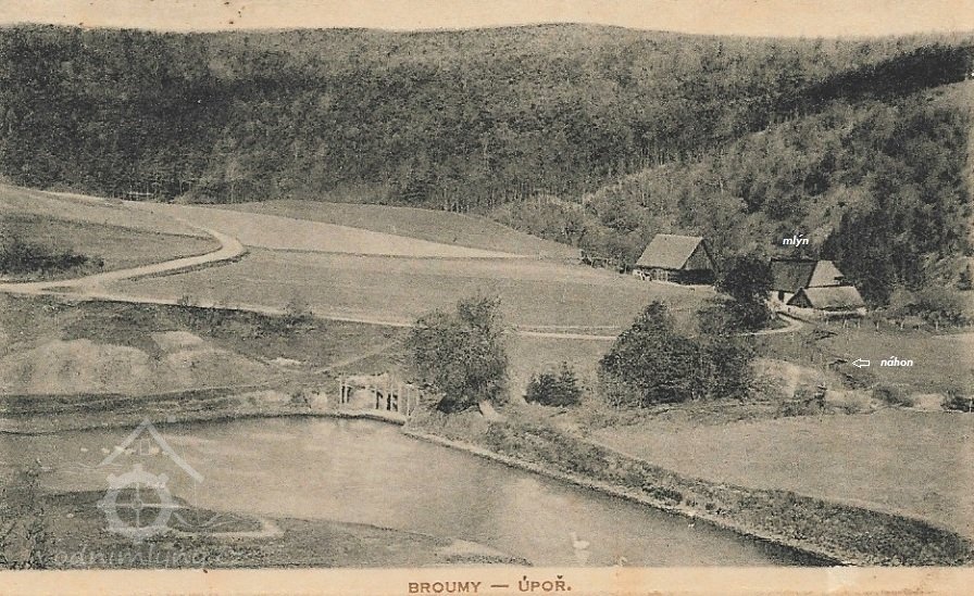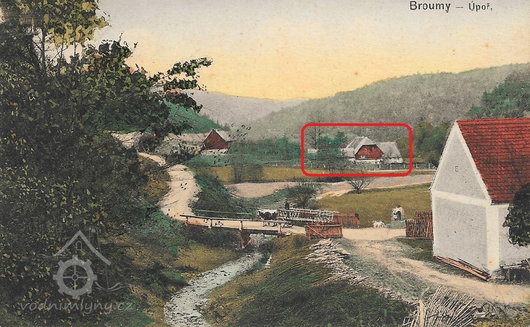 Mlýn s půčelím jižním byl vystavěn v nadmořské výšce 340 m necelých 30 m od levého břehu Úpořského potoka 1 km SZ od staré broumské návsi v místní části Úpoř. V roce 1872 se setkaly v oblasti tři bouřky a přišla obrovská průtrž. V úzkém údolí se voda neměla kam rozlít a vytopila mlýn. Mlýnská budova prošla ve 20. nebo 30. letech 20. století výraznou přestavbou. Do té doby byl mlýn přízemní s roubenou obytnou částí a poměrně vysokou sedlovou šindelovou střechou při východním štítu s polovalbou. Zda byl mlýn roubený po celém obvodu a existovala i západní polovalba není doloženo. Jisté je, že ve východním štítu byla čtyři okna (dvě okna obytné místosti měla větší rozteč než dvě podkrovní). Na východní štít navazovala zahrádka ohraničená dřevěným plotem. Komín vystupoval ze severnější poloviny střechy. Zmiňovanou přestavbou dostala mlýnská budova podobu celozděné "kvádrovité" patrové stavby s nevýraznou velmi nízkou sedlovou střechou s komínem v její jižnější polovině (tato podoba je dochována do současnosti). Vodní kolo, jež bylo umístěné při západním štítu mlýna, poháněl zhruba 150 m dlouhý náhon (v současnosti v terénu zčásti znatelný). Náhon odbočoval z Úpořského potoka do jeho levého břehu asi 50 m pod rybníkem (dříve nazývaný Dvorský, v nynějších mapách Kučerák, situovaný jižně od mlýna), který napájel. Ještě před r. 1914 byl k severní straně mlýna (ne k úplně celé S straně mlýna) přistavěn kolmo objekt se sedlovou střechou. Tento přístavek, jenž sloužil mj. pro přidružený vodní provoz pro potřeby hospodářství, zanikl někdy v letech 1953 - 1961 (v r. 2021 ještě stály vyskoké ruiny zdí přístavku). V r. 1936 za nových majitelů Jandů vzniklo vedle mlýna obytné stavení čp. 201 na st.p.77/2. Tento nový dům byl vystavěn částečně v místě býv. hospodářského objektu (stojícího JV při mlýnu) - trochu však posunut SV směrem. Je možné, že zároveň s výstavbou nového domu proběhla i zmiňovaná přestavba mlýna. Původní mlýnská st. parcela č. 77 tím byla rozdělena a mlýn tak obdržel parcelní číslo 77/1. Rodiny mlynářů až do vzniku nového vedlejšího domu žily ve východní části mlýnské budovy (v západní části byla mlýnice). Svého času ke gruntu náležely tyto pozemky: čtyři pole (dvě jižně a dvě západně od mlýna při cestě k dolejšímu mlýnu ((pův. jen pile)) čp.74), louky a pastviny (ty z větší části) směrem od rybníka ke mlýnu po obou stranách Úpořského potoka, které se táhly dále při potoce severně a západně od mlýna. Zda se ve mlýně mlelo i za 2. sv. války není zjištěné. Provoz mlýna byl definitivně ukončen v r. 1948 nástupem komunistické vlády, za které bylo někdejší mlýnské budově číslo pop. 40 odejmuto (v r. 2021 byl objekt býv. mlýna stále bez č. p. i č. ev.) a přeneseno na obytný objekt (pův. sloužící jako hájovna) 400 m ZSZ vzdálený. Dům čp. 201 byl obýván potomkem posledního mlynářského páru Jandů prokazatelně ještě v r. 1965, kdy již okolní pozemky dříve patřící k mlýnskému gruntu obhospodařovalo JZD Broumy. Jiný potomek Jandů objekt někdejšího mlýna i vedlejší dům č. p. 201 později prodal k rekreačním účelům novým majitelům - již mimo příbuzenství. V té době (na sklonku komunistické vlády) k vlastnictví mj. patřily: studna, domácí vodárna, dva chlévy, zděný kurník, venkovní sklep, suchý záchod, dvě dřevěné králíkárny + strojní zařízení mlýna nezpůsobilé provozu. Hospodářský objekt 50 m jižně od mlýna na st. p. 76, též původně náležící k majetku mlynáře, byl také prodán a přestavěn na obytný dům čp. 347.