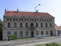 Místo posledního okna na pravé straně vedou další dvoukřídlé dřevěné, v horní části prosklené dveře do původního krámu. Dnes je zde agitační středisko. Nad vstupními dveřmi z průčelí vystupuje balkón, nesený čtyřmi konzolami, zdobenými volutami, zábradlí balkonu je z kamenných kuželek, rohové sloupky jsou jednodušší, kvádrové, madlo je rovněž kamenné kryté plechem. Okna patra jsou v dolní části stojná jako do přízemí. Shora na ně navozuje půlkruhová část členěná půlkruhem ve středu a dále dvěma paprskovitě navazujícími laťkami. Okolo oken jsou šambrány. Na balkon vedou s chodby patra dvoukřídlé dřevěné dveře s rovněž půlkruhovým nadsvětlíkem. Okna jsou rámována jednoduchými plochými pilastry, které jdou mezi kordonovými římsami nad přízemím a nad patrem. Na krajích u štítů je omítka zdobená nárožní rustikou.