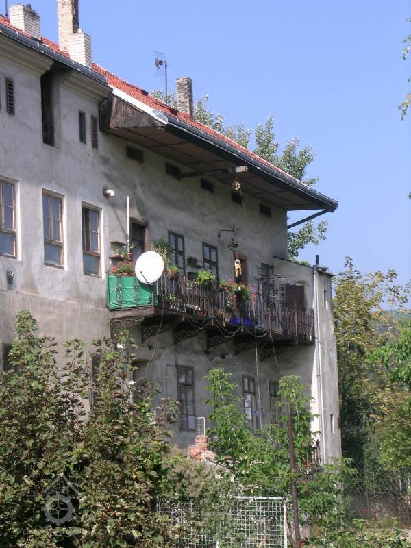 Do patrové budovy vedou v přízemí a patře stejná čtyřkřídlá dvojitá dřevěná okna. Spodní křídla jsou rozdělena na tři části. Na pravé straně od dveří vedou do pavlače vždy čtyři, na levé straně v přízemí tři a v patře rovněž čtyři okna. Nad pavlačí střecha výrazně přesahuje průčelí. V levé části je průčelí u střechy zakončeno hlavní římsou. V pravé části je spodní stěna předsazené střechy pobita prkny. Pod římsou jde do půdy osm úzkých vysokých otvorů s předsazenými žaluziemi. V pravé třetině této části vede do půdy dveřní otvor. Pod předsazenou střechou nad pavlačí je do půdy pět nízkých širokých otvorů rovněž se žaluzií. U terénu je na fasádě několik dveří do půdních prostorů.