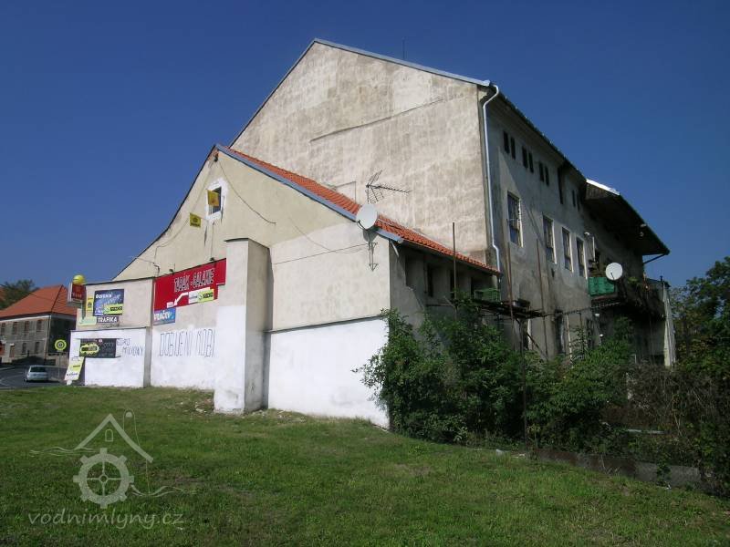 Do půdy jde 18 sdružených oken. Mezi okny jsou střídavě užší a širší lizény spojující kordonovou římsu nad patrem a hlavní římsu. Okna jsou jednokřídlá z dřevěných žaluzií. Sdružují se vždy po dvou s úzkým sloupkem uprostřed. Na pravé straně průčelí pokračuje přístavkem mlýnské budovy krytým valbovou střechou. Z jihu jsou zdi přístavku ubourané. Na jeho fasádě jsou pouze plechové jednokřídlé dveře s prahem asi 50 cm nad chodníkem. Jižní štít je holý, pouze omítaný, severní je rozčleněn dvěma trojicemi oken stejných jako na západním průčelí, mezi kterými jde kordonová římsa. Krajní okno do přízemí a pravé okno do patra jsou zevnitř zazděno. Omítka této fasády je téměř celá opadaná.