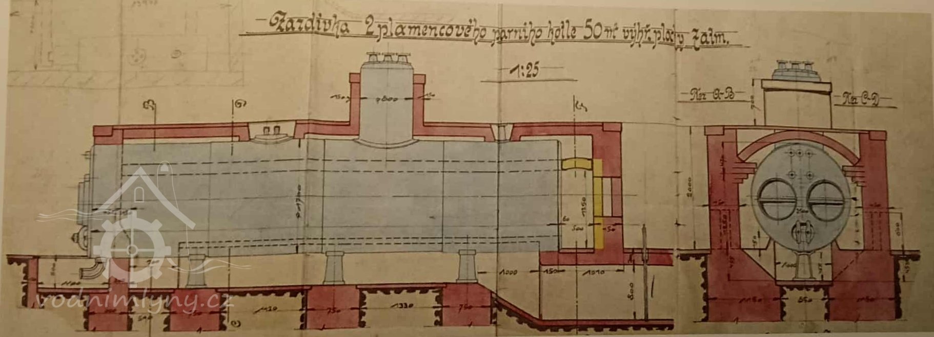 Popis1921 byl zakoupen parní stroj s výkonem 75 koňských sil a zahájeno budování parní kotelny s kotlem o výtlaku 7 atmosfér. Dominantou se stal 25 m vysoký železný komín.