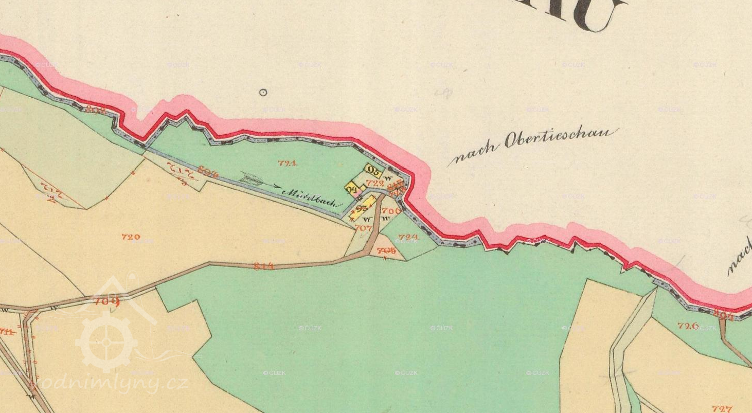 Mlýn je poprvé zachycen pravděpodobně na mapě I. vojenského mapování.