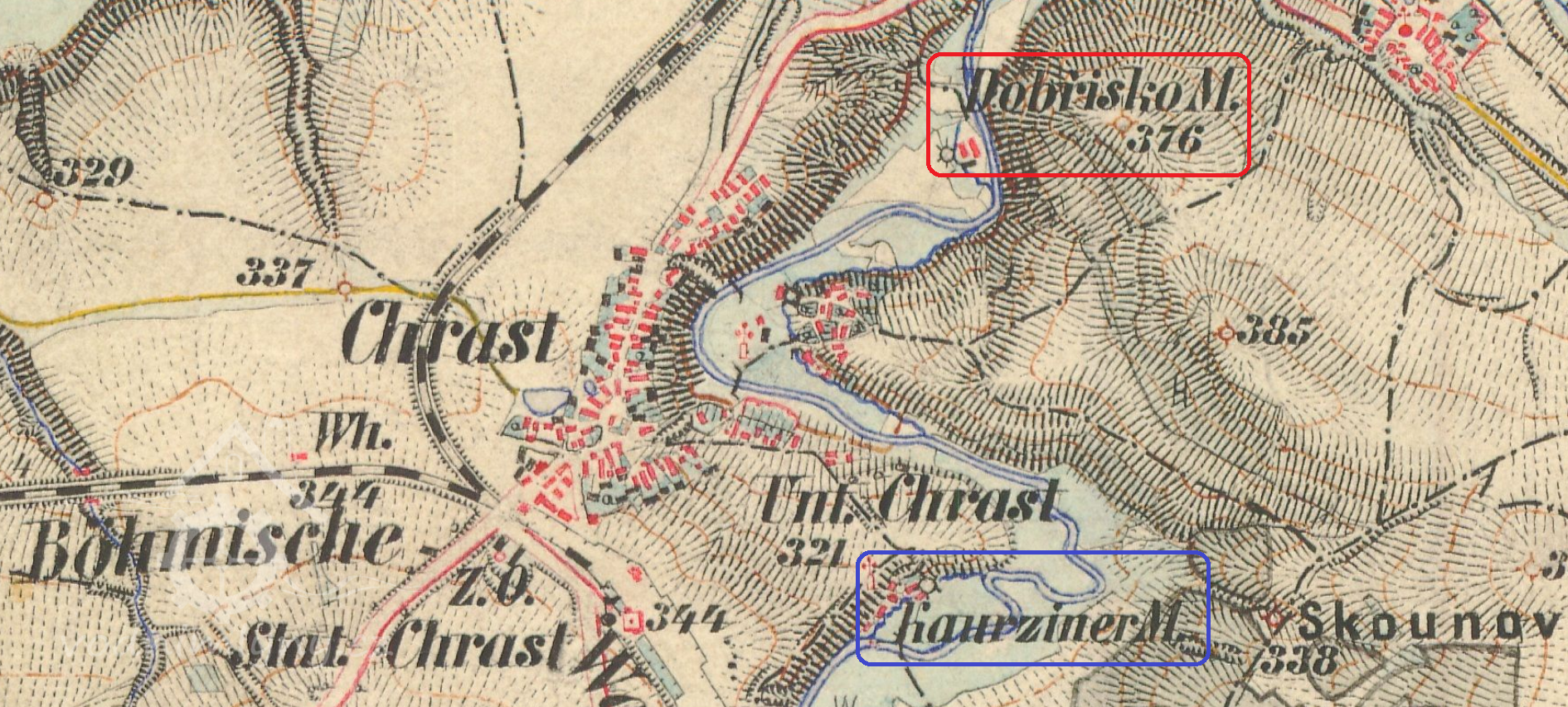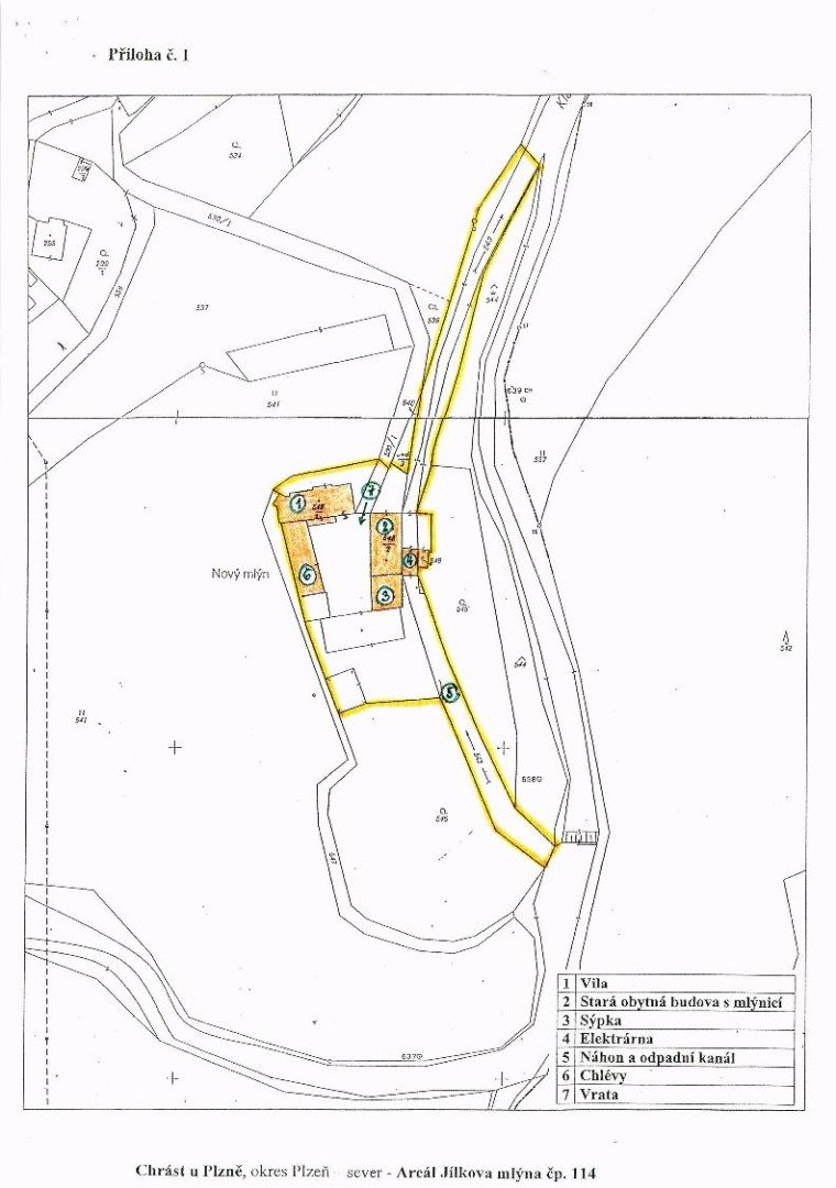 Areál Nového neboli Jílkova mlýna /zvaného také Dobřískov /, nalézá se na levém břehu řeky Klabav, přibližně 3 km nad jejím ústím do Berounky, na severním okraji obce. Jednotlivé budovy jsou uspořádány na téměř obdélném půdorysu, mírně se rozšiřujícím k severu, podél náhonu 200 m dlouhého. Tvoří téměř uzavřený dvůr. Přístupová cesta odbočuje ze silnice Chrást - Smědčice a míří ke dvoru proti proudu řeky, od severu. Vpravo od vstupní brány se nachází moderní dominanta celého hospodářství - vila z r. 1920. Je postavena na nepravidelném půdorysu, který má nejblíže k obdélníku. Architektonické pojetí lze označit za individualistickou modernu, nesoucí řadu prvků doznívající secese a nastupujícího kubismu. V blízkém okolí /Nová Huť/ lze nalézt i další stavby shodného autorského rukopisu Budova je zčásti postavena na základech starého domu z 1. pol. 19. stol. Není podsklepena má dvě nadzemní podlaží. Zdivo novostavby je převážně cihlové. Fasáda v přízemí provedena z režného zdiva /bílé cihly/, zbytek v jednobarevném břízolitu. Je bohatě členěna /římsy, náznaky pilastru, polosloupy ve štítě/, vyznačuje se množstvím zdobných prvků. Okna jsou orámována, zvýrazněny parapety Ze severního průčelí vybíhá mělký rizalit, prostupující římsou, ukončený tvarovaným štítem. Rozměrné obloukové okno v ose rizalitu, rozdělené sloupky do třech svislých nestejně vysokých pásů osvětluje halu se schodištěm. Okénka ve štítu vedou do půdního prostoru. Průčelí dále obsahuje vlevo od rizalitu jednu, vpravo pak dvě okenní osy. V severozápadním rohu z budovy vybíhá úhlopříčně rizalit, též prostupující římsou, zakončen jehlancovitou střechou. Tvoří jakousi obdélníkovou věž, navazující na severní průčelí malou lodžií. Vstup na ni je možný prosklenými dveřmi z patra. Každá stěna rizalitu má po jedné okenní ose, podobně jako fasáda domu orientovaná západně. Naproti tomu průčelí východní obsahuje 3 okenní osy. Dvorní průčelí / jižní / má opět v ose mělký rizalit, který ale v pravé části, cca ve 2/3 šířky pokračuje do dvora v hloubce asi 1,5 m, Za dvěma klenutými oblouky je před hlavním vstupem do domu vytvořen krytý prostor - „loubí".