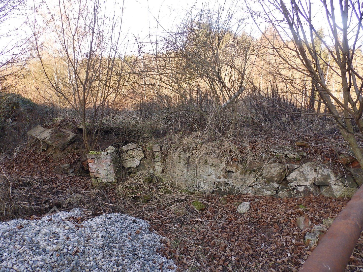 Východní stěna, k níž je přistavěna elektrárna, má po pravé straně dvě okenní osy.