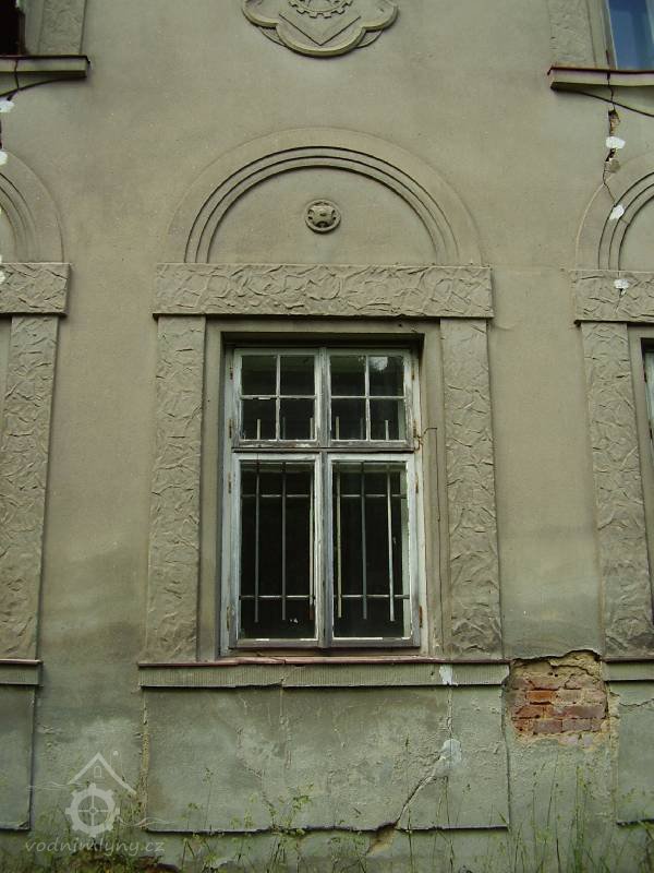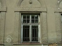 Dvě obdélná okna v patře se štukovými šambránami, nárožní pilastry se stylizovanou hlavicí.