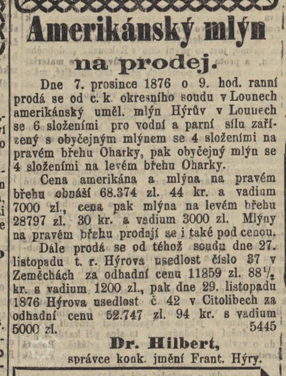1855 - koupil František Hýra, mlynář z Loun, pozemek na stavbu velkého mlýna