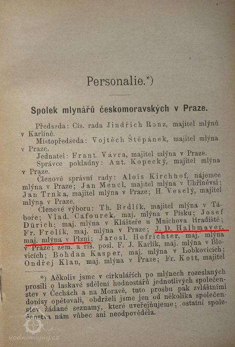 1899 - majitel mlýna J. D. Halbmayer členem správní rady Spolku mlynářů česko-moravských v Praze (Fr. Duška, Kapesní kalendář mlýnů česko-moravských, r. 1899