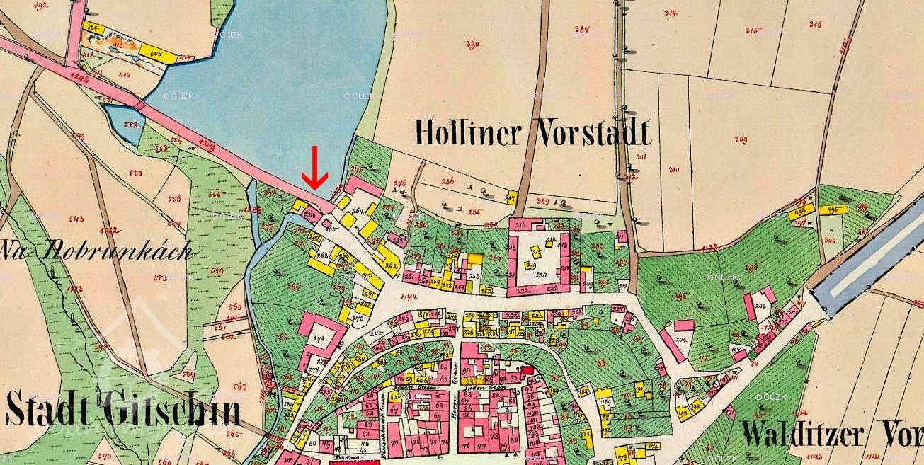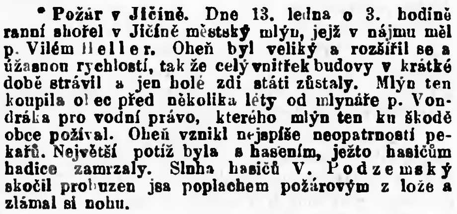 Vroce 1760 prodala obec mlýn takzvaný podvodárský Františku Javůrkovi, ten se však špatně porovnal. proto již v roce 1762 obec prodala mlýn Janu Samohrdovi; ne nadlouho; po roce 1770 Janu Saalovi;Roku 1770 platil ročně mlynář Jan Saal 130 zlatých a za službu při vodárně městské a za bukové a habrové dřevo, kterým v zimě vodárnu vytápěl dostal 15 zlatých a 30 krejcarů. 1791 koupili mlýn od vdovy Kateřiny Saalové a sirotků manželé František a Viktorie Šefelinovi, v roc1794 Václav a Rosálie Riegrovi, 1798 Matěj Půhonný, 1799 Josef a Kateřina Machačkovi; roku 1816 dědil mlýn Václav Machačka. Roku 1846 koupil mlýn,zahradu pole a luka Adolf Laurich z Jablonce, přistavěl k mlýnu vysoký komín a na pohon koupil parní stroj (první v Jičíně). Mlýn vyhořel toho roku a přešel na Jana Schmidta, pak na Jana Neuberta.