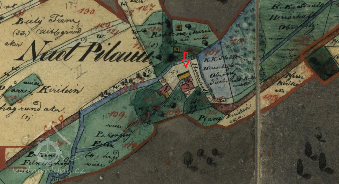 Mlýn dohledán na mapách I. vojenského mapování. Kousek nad mlýnem blíže k Poutnímu kostelu Jména Panny Marie se nacházela pravděpodobně pila, proto je mlýn zmiňován jako Nad pilou.