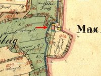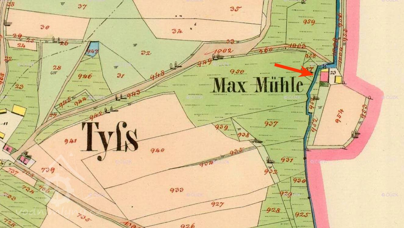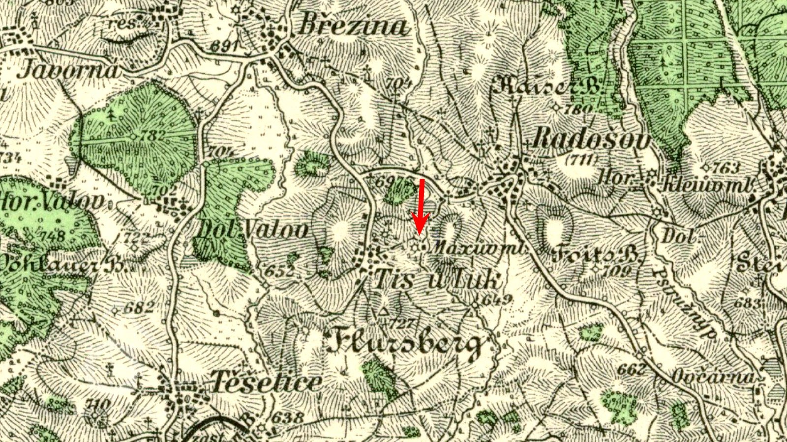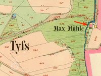 Na levém břehu Klein Giessbachu, známého pod novějším názvem Malá Trasovka zhruba 400 metrů na východ od dnes zaniklé obce Tis (Tiess), byl v druhé polovině 18. století vybudován mlýn Maxmühle. Budova vodního mlýna se poprvé objevuje na mapě 1. vojenského josefského mapování probíhajícího mezi lety 1764-1768. Vodní kolo, které bylo umístěné na severní straně budovy mlýna, poháněla voda potoka proudící náhonem z blízkého rybníka "En Teich".