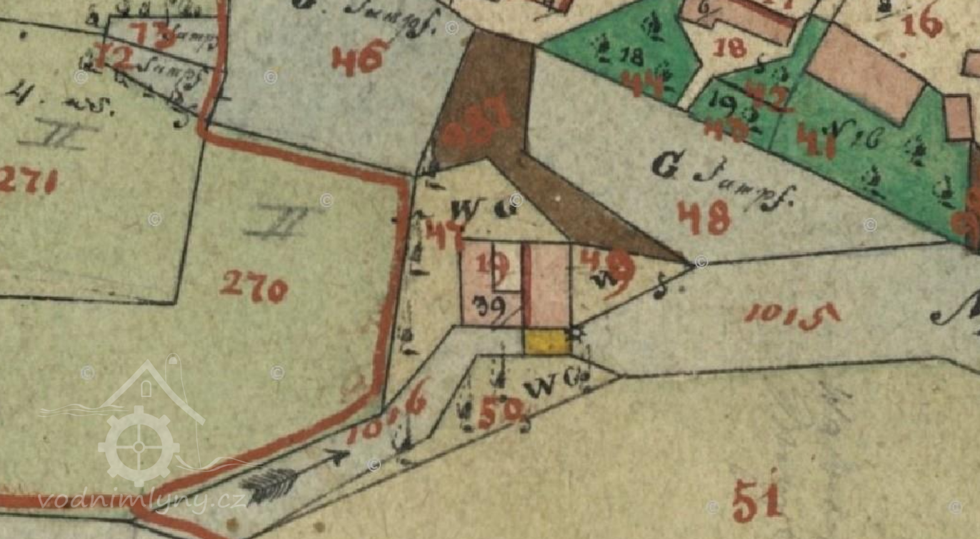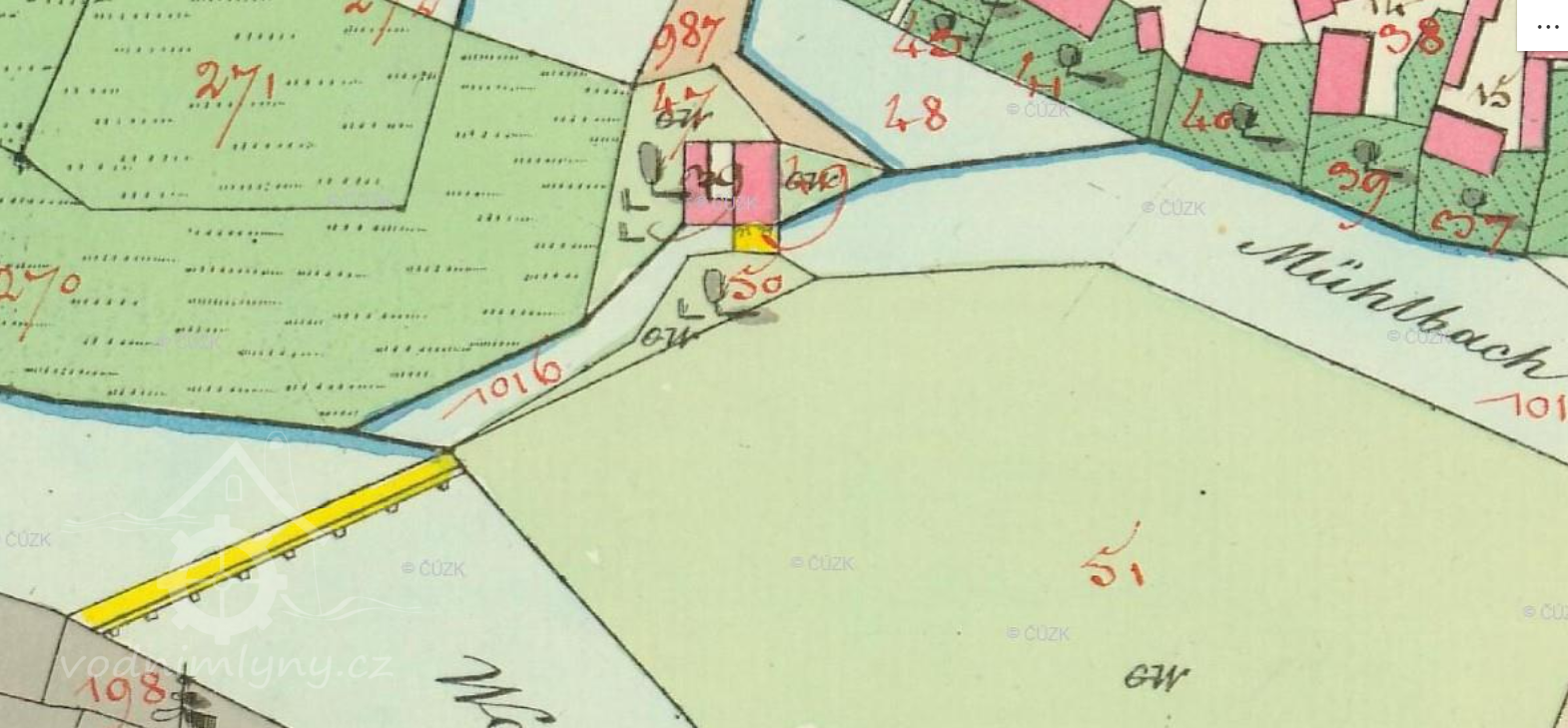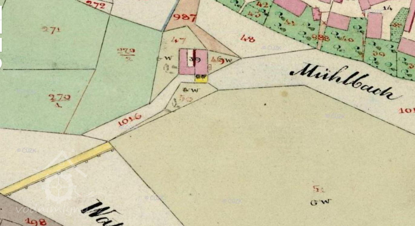 1874: Mlýn na řece Otavě na levém břehu na zvláštní mlýnské stoce, která nahoru k jezu a dolů do řeky prodloužena jest. Stavidla jsou 3, jedno jalové a 2 na mlýnu.