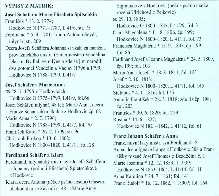 Podle zápisů v pozemkové knize velkostatku Starý dub náležel mlýn v 1. pol. 18. st. k domaslavickému dvoru knížete Hartiga. V roce 1859 koupila mlýn Marie Anna Schäferová pro svého syna Josefa za 600 kop. Ve stejné pozemkové knize se dochovala také svatební smlouva Josefa Schäfera s druhou manželkou Marií Annou Schauschkovou z Hodkovic. Jejich sňatek se uskutečnil dne 28. července 1795 v Hodkovicích. Josefovi bylo tehdy 48 let. 7. dubna 1804 převádí Josef Schäfer mlýn na svého syna Ferdinanda za 3200 zlatých. Dalším byl jeho Ferdinandův syn Franz, který získal mlýn od svého otce 20. července 1842 za 5600 zlatých.