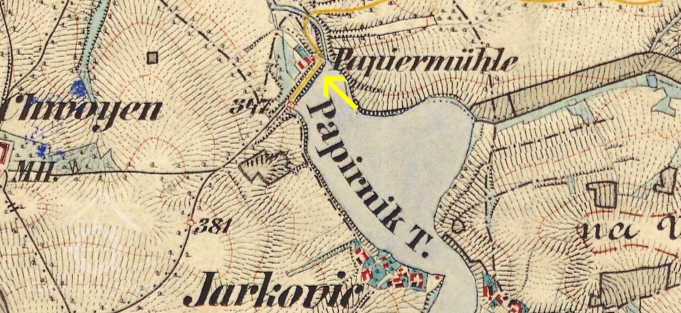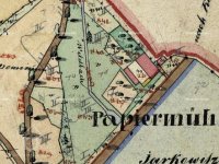 Papírna byla založena v roce 1793 Františkem Geiszlerem, který do té doby provozoval papírnu v Postupicích. Budova byla 32 m dlouhá a 15 m široká, v přízemí byly umístěny papírnické dílny a obydlí, v podkroví dva byty a komory, na půdě se sušil papír. Podnik bohužel příliš neprosperoval. Roku 1837 byl při papírně zřízena mlýnice, v roce 1851 jej koupil Jan Karel z Lobkowicz, majitel panství v Konopišti. Ten papírnu zrušil a výrobu přemenil na stupník k drcení kostí pro výrobu spodia pro panský cukrovar. Později objekt sloužil jako pila, kolem roku 1900 přestavěn na obydlí pro zaměstnance panství. Vedlejší mlýn byl pronajímán. V roce 1906 byla papírna s mlýnem poškozena povodní a následně stržena. Na místě byly zřízeny sádky s obydlím baštýře.