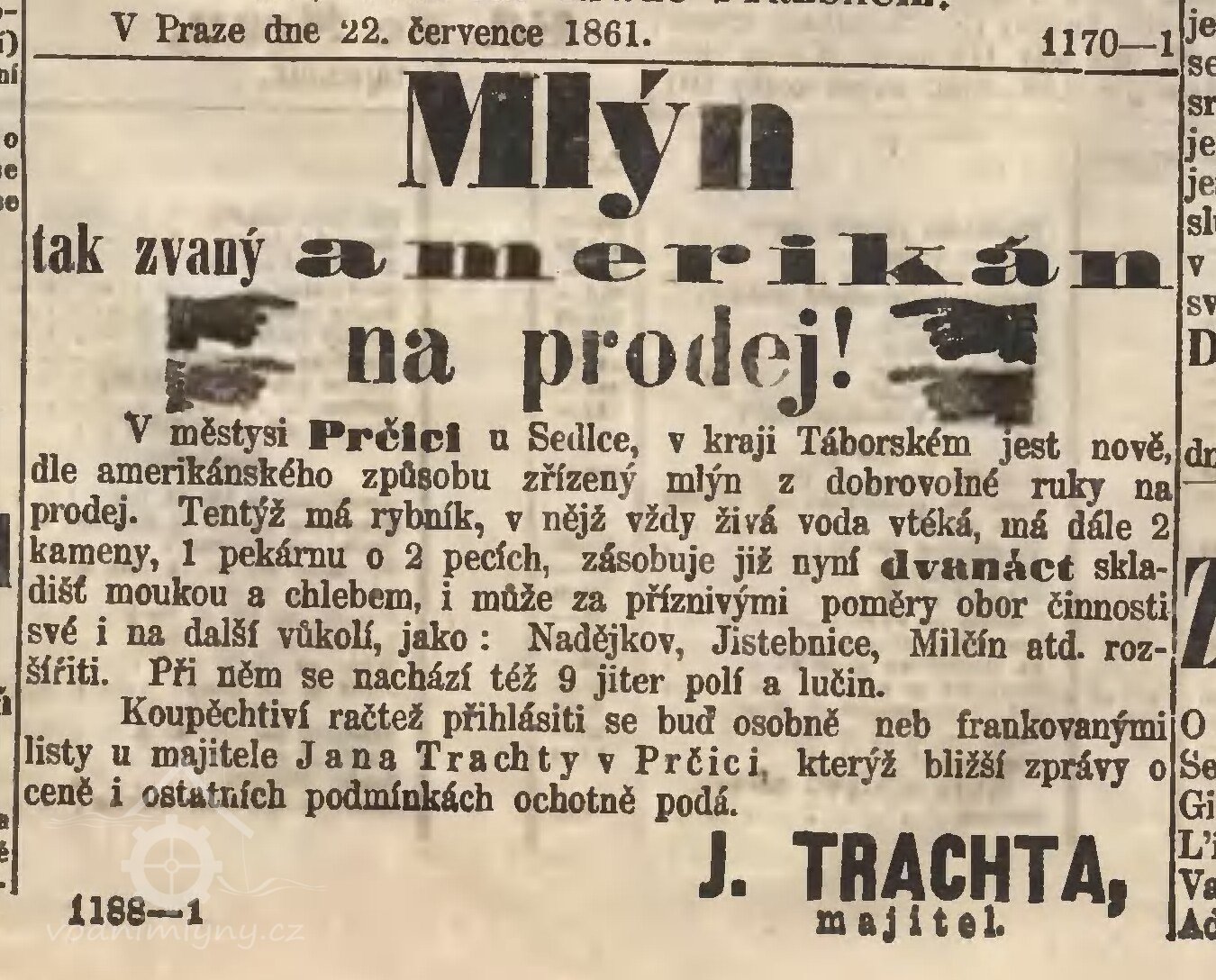 Jan Vit Malovec z Malovic, pán statku prčického a uhřického, prodal mlýn prčicky, zvany ,,Hořejší" a ,,Ve Straně“ Janu Sovovi; v kontraktu ze dne 24. dubna 1764 uvedeno jest mimo jiné: