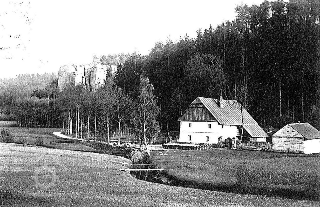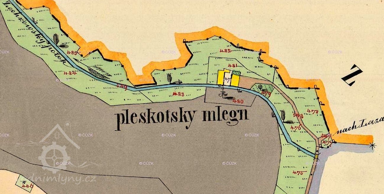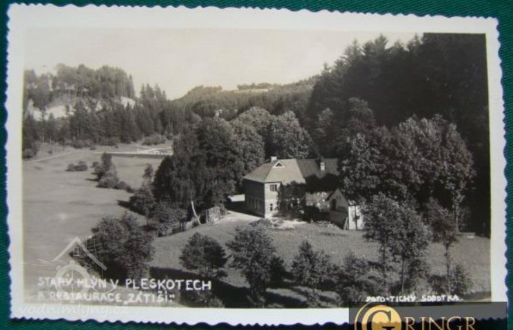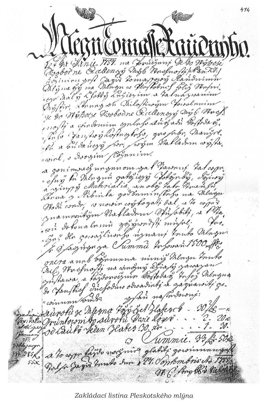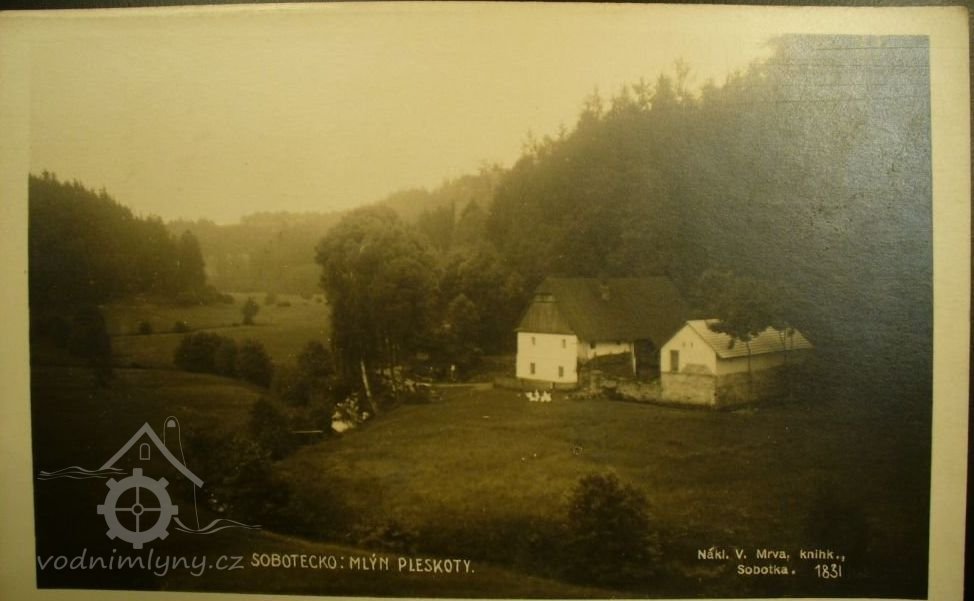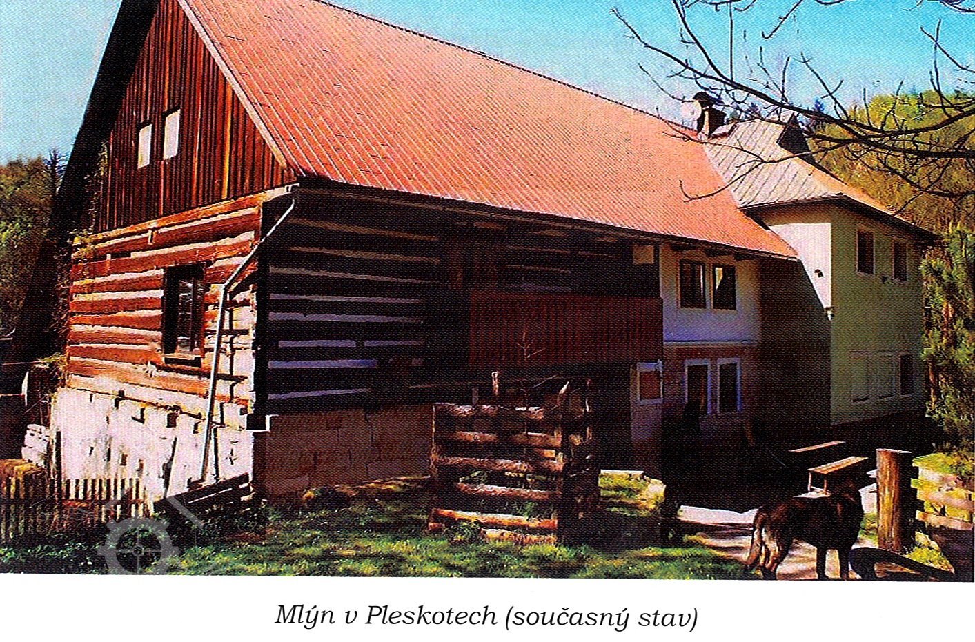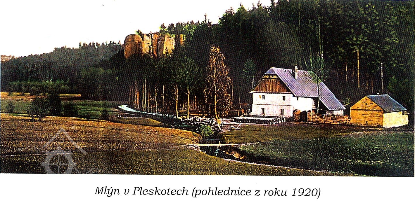 1754 - postaven mlýn s povolením kostecké vrchnosti mlynářem Tomášem Roudným. O mlýnu více Josef Pekař v Knize o Kosti: „Od mlýna Podvyskeřského (kde byl dnes zaniklý rybník) až skoro k mlýnu Nebákovskému pod Troskami šla tedy hranice mezi kosteckým a skalským panstvím divokým údolím Lažanským. Mlýn tu však náležel ke Kosti jen jediný, rozkošně položený mlýn Pleskotský. Byl postaven teprv roku 1754 mlynářem Tomášem Roudným. … Nový mlýn o dvou složeních, k němuž si mlynář vedl strouhu od rybníka Podsemínského, byl proto vložen do gruntovních knih v ceně veliké, 1500 kop míšeňských. ...“ ( s. 226)