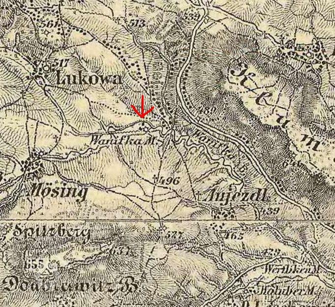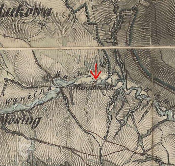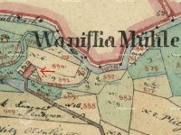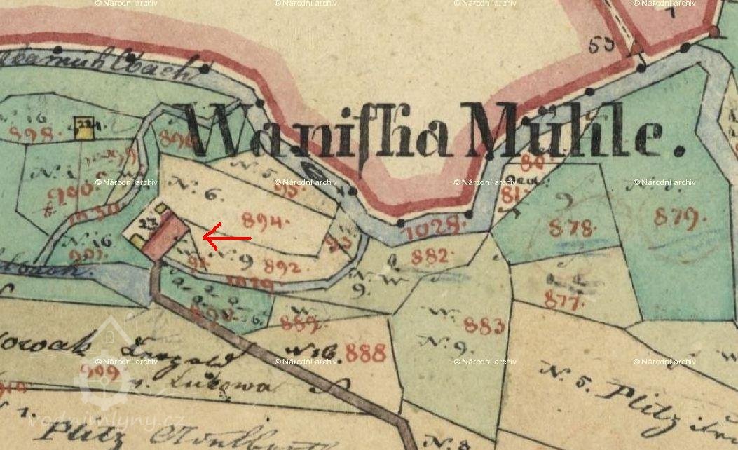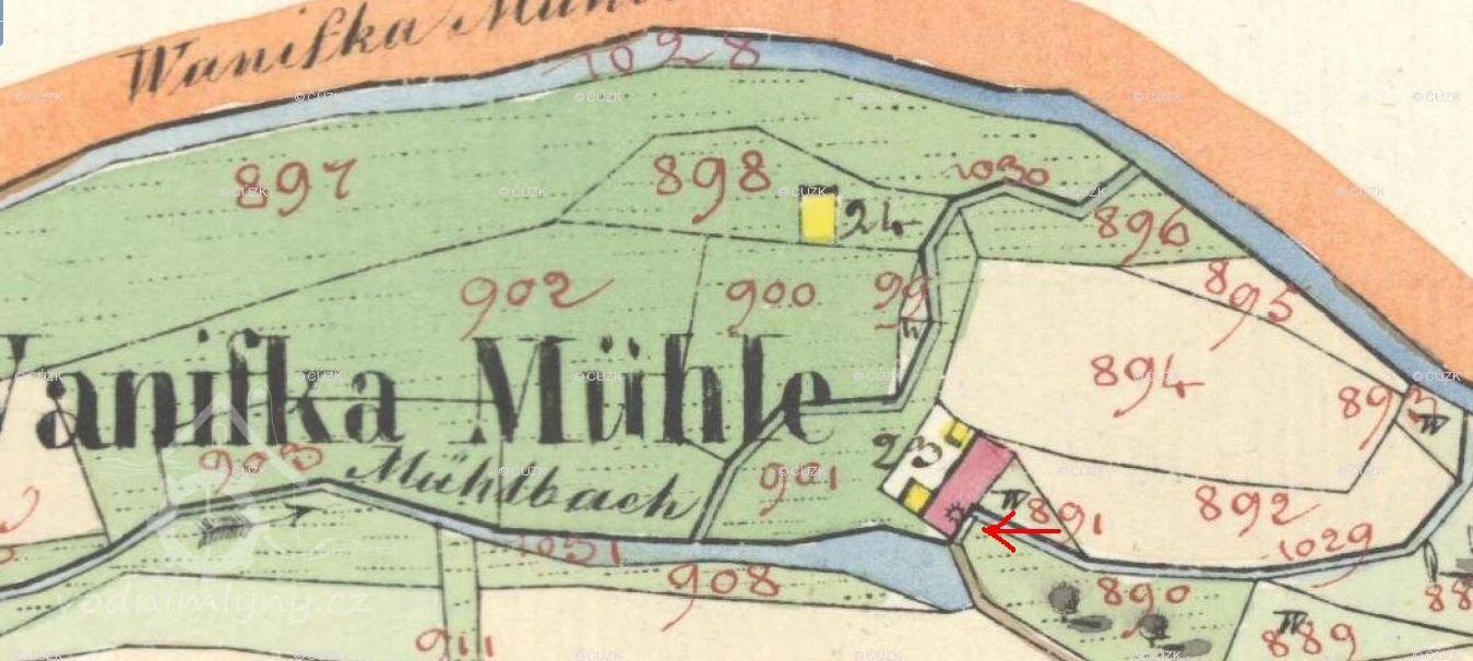V r. 1885 tu mlynařil Johann Novák. Při vyměření a usazení nivelační značky ze dne 3. září 1897 bylo zapsáno, že mlýn leží na pravém břehu "Wanifkova potoka" a na levém břehu vychází z potoka strouha, kterou je přiváděna voda na mlýnské kolo. Vodní mlýn se skládal ze dvou mlýnských složení a z jednoho "Holanďana", které byly uváděny do provozu dvěma za sebou postavenými koly na svrchní vodu. Mlýnské vantroky byly 5,5 m dlouhé a vodní kola byla vysoká 4,63 m.