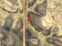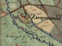 Obilní mlýn s pilou/katr a lísovnou oleje Johanna Jäckla čp. 53 v Gottmansgrün (Pastviny), takzvanný Ziegenmühle, na pravém břehu Regnitz (Rokytnice).