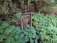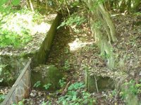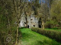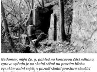 Vzadu, na konci náhonu vpravo, je místnůstka, sloužící jako akumulační nádržka, kde je vytesán kříž a dochovalo se slepé okno a výklenek, nejspíše pro svatý obrázek a sošku., 08 2011, © Vladimír Kraus, (Prvky na obrázku: náhon, akumulační nádržka)