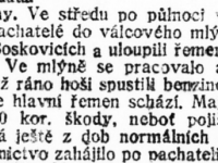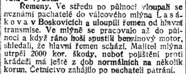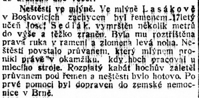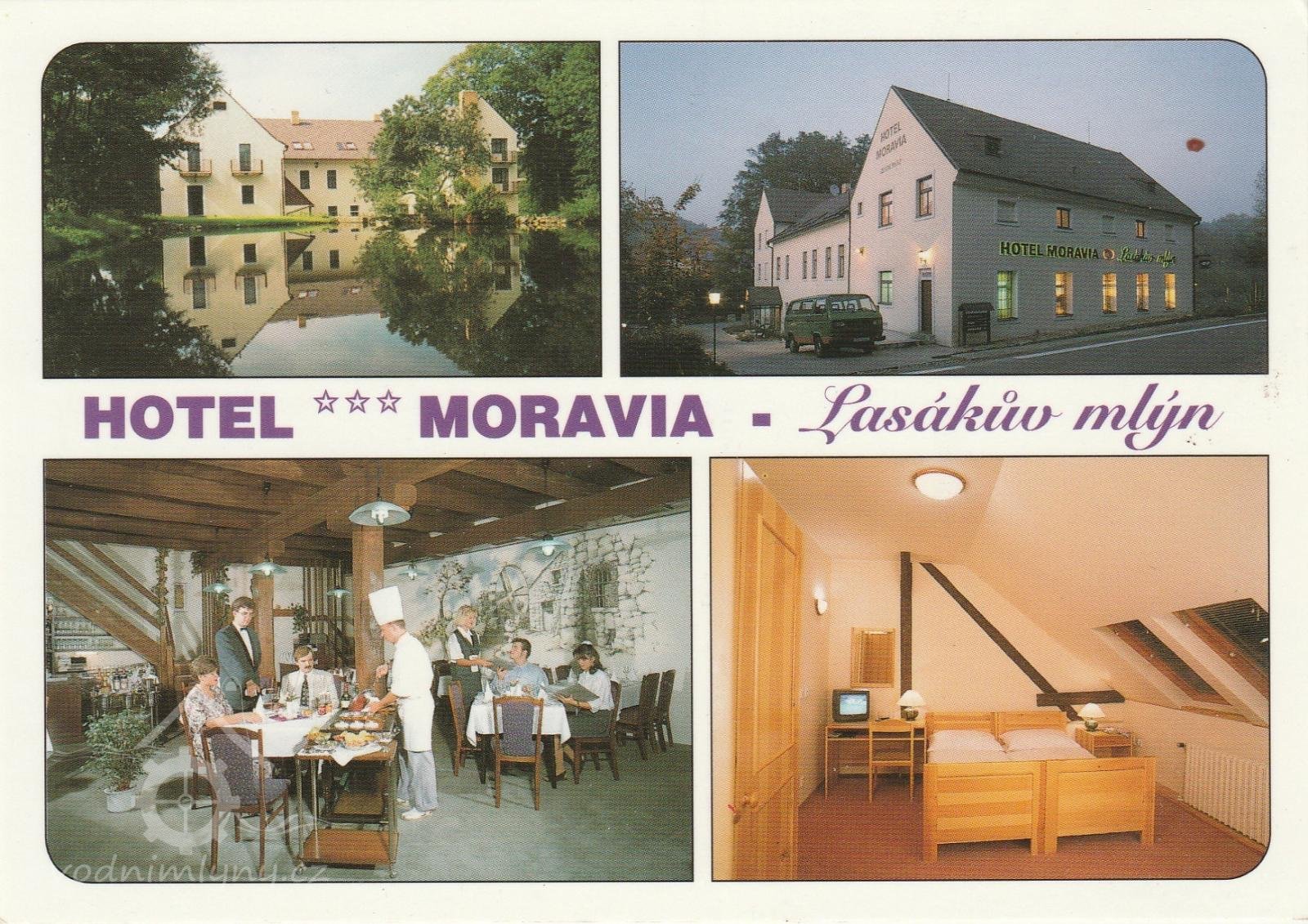 Ještě v sedmdesátých letech, kdy jsme chodívali na rybník bruslit, měl mlýn dvě masivní široká vodní kola typu korečník na horní vodu s rameny řešenými jako "obkročák", v lednici mezi mlýnem a silnicí (jižní průčelí, dnes zasypáno sutí z přestavby mlýna na hotel). Kola v té době byla již dost poškozená. Lednice byla shora zakrytá dřevěnými prkny a vedla po ní lávka z cesty do mlýnice. Kola byla na průběžných dřevěných hřídelích v lednici postupně za sebou. Byla vzájemně přesazená tak, aby na každé z nich mohl vést samostatný vantrok. Stříška kryla vantroky tak, aby do nich nemohl ze silnice nikdo házet kamení. Každé vodní kolo mělo své palečné kolo a ocelový předlohový hřídel typu "vystrák" (kolo z palečného převodu leží jako dekorace u mlýna dodnes). Jedno vodní kolo sloužilo k pohonu velikého kamenného složení - šrotovníku s francouzskými kameny (pamětníci tvrdili, že potřeboval hnací výkon až 25 HP). Druhé kolo sloužilo k pohonu transmise a celého soustrojí válcového mlýna. Tu tvořila sestava - Kašparova loupačka, cca 4 výtahy, dvě válcové stolice. Horní transmise pod střechou byla uložená na dvouřadých naklápěcích kuličkových ložiskách od firmy SKF a prostřednictvím řemenů poháněla koukolník, dva hranolové vysévačče, jeden rovinný vysévač "plansichtr" (ze kterého se přímo pytlovalo) a velkou reformu na krupici. Obě transmise byly mezi patry propojené svisle vedeným plochým řemenem. Tento hlavní pohon byl umístěný na východní straně budovy. Tam byly transmise nejsilnější (spodní o průměru cca 100mm, horní cca 50mm), na druhém konci (v západní části budovy) byla už transmise tenší. Mlýnice byla na relativně malý počet strojů velmi prostorná i vysoká a oproti jiným mlýnům, které jsem znal, mi subjektivně připadala jako by "prázdná". Přišlo mi, že budova byla postavená s určitou rezervou, plánovaná a nachystaná na další budoucí rozšíření mlecí technologie, ke kterému však už nikdy nedošlo. Podstřešní prostor byl stroji vyplněn se standardní hustotou, ale více v západní části. V části východní by se ještě několik vysévačů vešlo. Hlavní transmise v podkolí byla umístěná v ose východ-západ u jižní (návodní) strany mlýna. V suterénu mlýna, v samostatné suterénní místnosti na východní straně (bezprostředně u hráze rybníka), byl podle pamětníků umístěný ležatý čtyřtaktní jednoválcový vodou chlazený spalovací motor na koksový plyn se dvěma setrvačníky, plynový generátor a pračka plynu. Já tam tento motor již nepamatuji (hovořím o r. 1988), ale fundamenty po něm byly zachovány. Při detailnější prohlídce bylo patrné dosti značné opotřebení strojů (i přes jejich řádné mazání). Kluzné pánve ložisek, zejména u hranolových vysévačů, byly mnoho milimetrů do hloubky doslova "probroušeny" a "prořezány" otáčejícími se hřídeli. Kuličková ložiska měla až milimetr hluboké "vyběhané" drážky v kalených kroužcích ve směru, kam tlačil svou vahou hřídel nebo táhl řemen a i při pomalém otáčení byla velmi hlučná. Na západním průčelí mlýna, nízko nad zemí, vyčníval ven z budovy hřídel opatřený řemenicí se srpovitými rameny. Sloužil jako příležitostný pohon odvozený z hlavní transmise pro cirkulárku nebo o žních pro pohon mlátičky postavené dočasně na volném ploše vedle mlýna (dnes příjezdová cesta před hotel). Mlýn měl elektrické osvětlení a z počátku prý i vlastní dynamo. Já tam dynamo už nepamatuji, ale jeho sokl v podkolí mlýna ano (r. 1988). Podle dosupných informací se ve mlýně za socialistické éry už jen krátkou dobu šrotovalo a pohon byl třífázovým kroužkovým elektromotorem s rozběhovým reostatem. Od vodních kol vedl odpadní kanál, který se napojoval na říčku Bělou daleko po proudu za mlýnem (49.4827842N, 16.6800397E), tedy těsně před bodem, kde začínalo vodní právo Dvořáčkova mlýna a hladina vzdutá jezem na Bělské ulici. V období sedmdesátých let pamatuji mlýn jako uzamčenou budovu, prý ve správě Školního statku Boskovice. V obytné části mlýna bydlel pan Řehula, který byl zaměstnaný v městských lázních jako plavčík a učitel plavání. Celkově budovy už působily chátrajícím dojmem. Dnes je budova zcela přestavěná a slouží jako hotel Morávia. Na jalovém přepadu rybníka bylo někdy po roce 2000 postaveno dekorační vodní kolo - korečník s vnitřním nátokem. Nemohu doložit přesná data, ani obrázky. Jsou to jen vzpomínky na mládí.