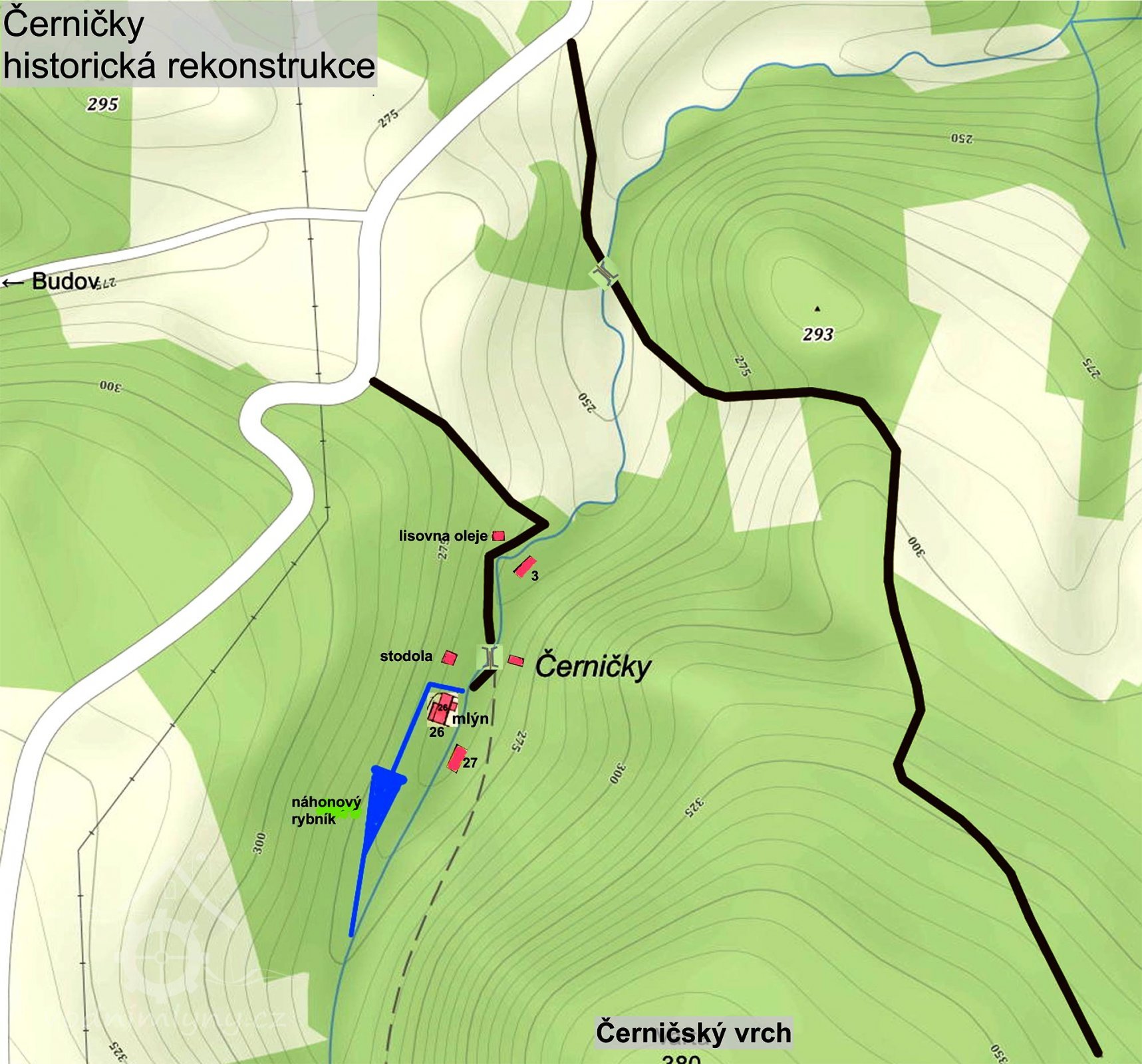 Mlýn byl prvním stavením po proudu a zároveň největším stavením v Černičkách.