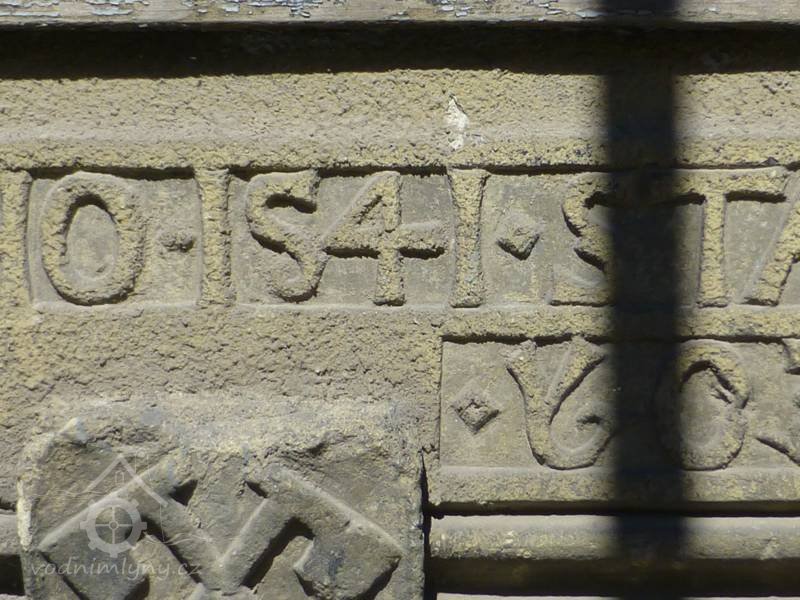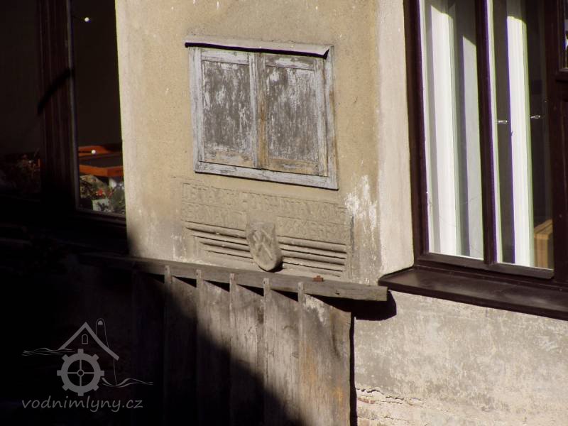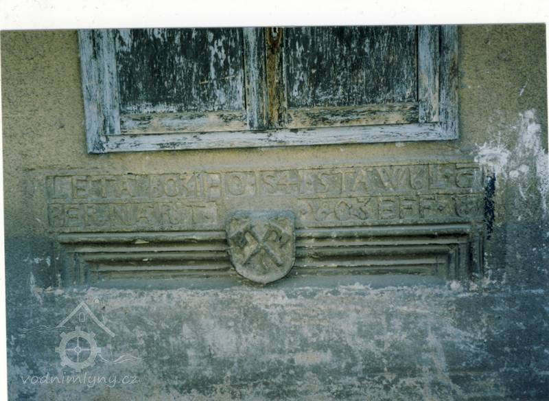 Nápis je dnes druhotně umístěn ve fasádě domu. Jak je ale patrné z části dochovaného profilovaného ostění, původně býval nad vchodem do mlýna. Nápis je tohoto znění: LETA▪BOZIHO▪1541▪STAWYL▪G[EST] BERNART▪ ▪YOZEFF▪ Na konci řádku je malý štít se znamením křížku na vlnce (snad se jedná o tzv. merk). Do středu druhého řádku zasahuje štít se dvěma zkříženými sekerami. Tento nápis je nejstarší epigrafickou památkou v Čechách datující stavbu mlýna.