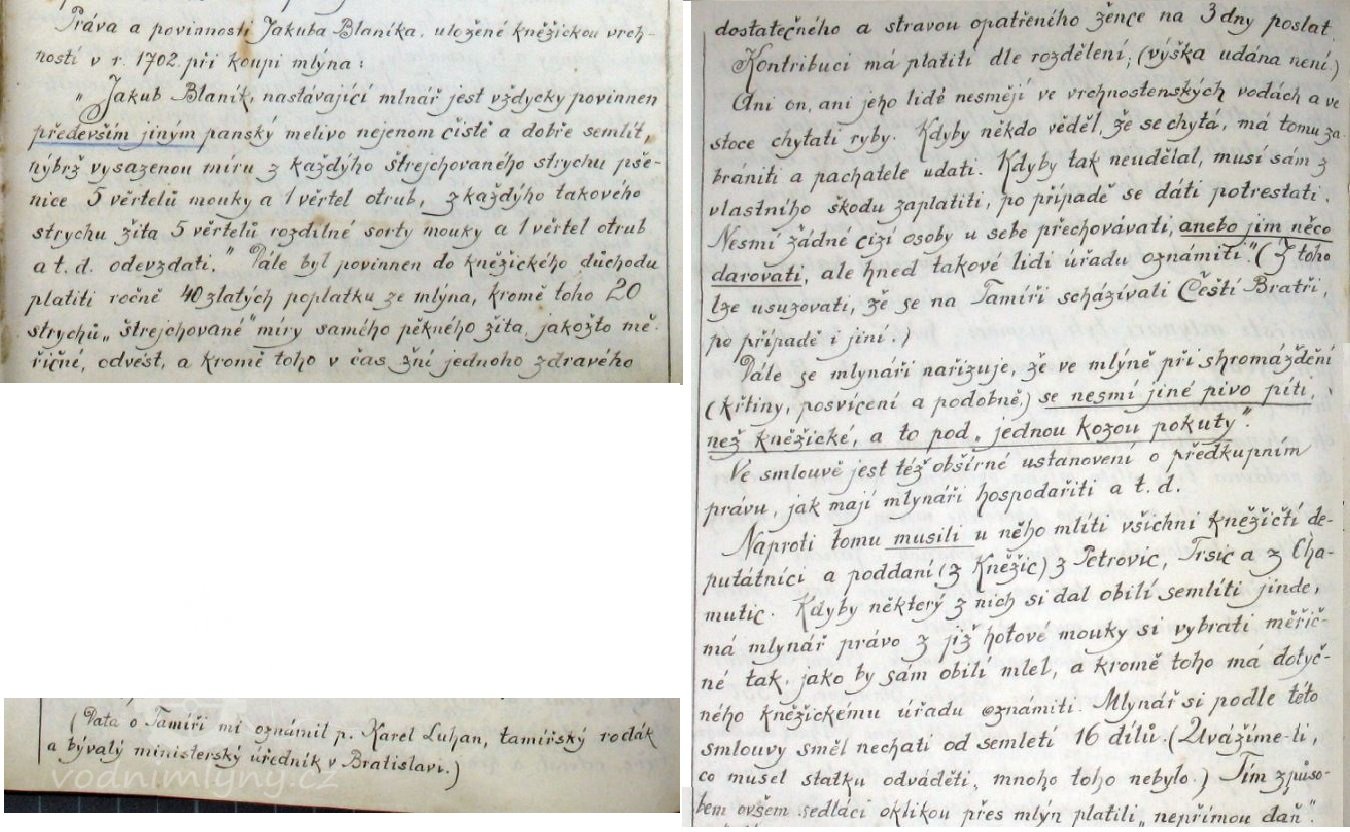(Zajímavé je, že v obou těchto smlouvách si kněžická vrchnost vyhradila předkupní právo pro případný další prodej. Tamířští mlynáři měli kněžičkou vrchností přesně stanoveny povinnosti jak mlít obilí, kolik odvádět do Kněžic, jaké platit poplatky. Zakazovalo se jim přechovávat zde cizí osoby, nebo jim něco darovat. Mlynáři se nařizovalo, že při rodinných oslavách (křty, svátky apod.) nesmí pít jiné pivo než kněžické a to pod pokutou jedné kozy.)