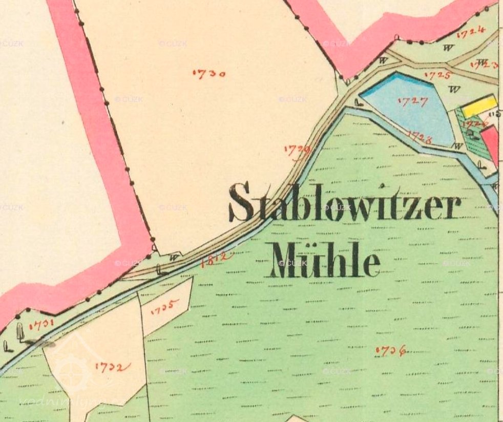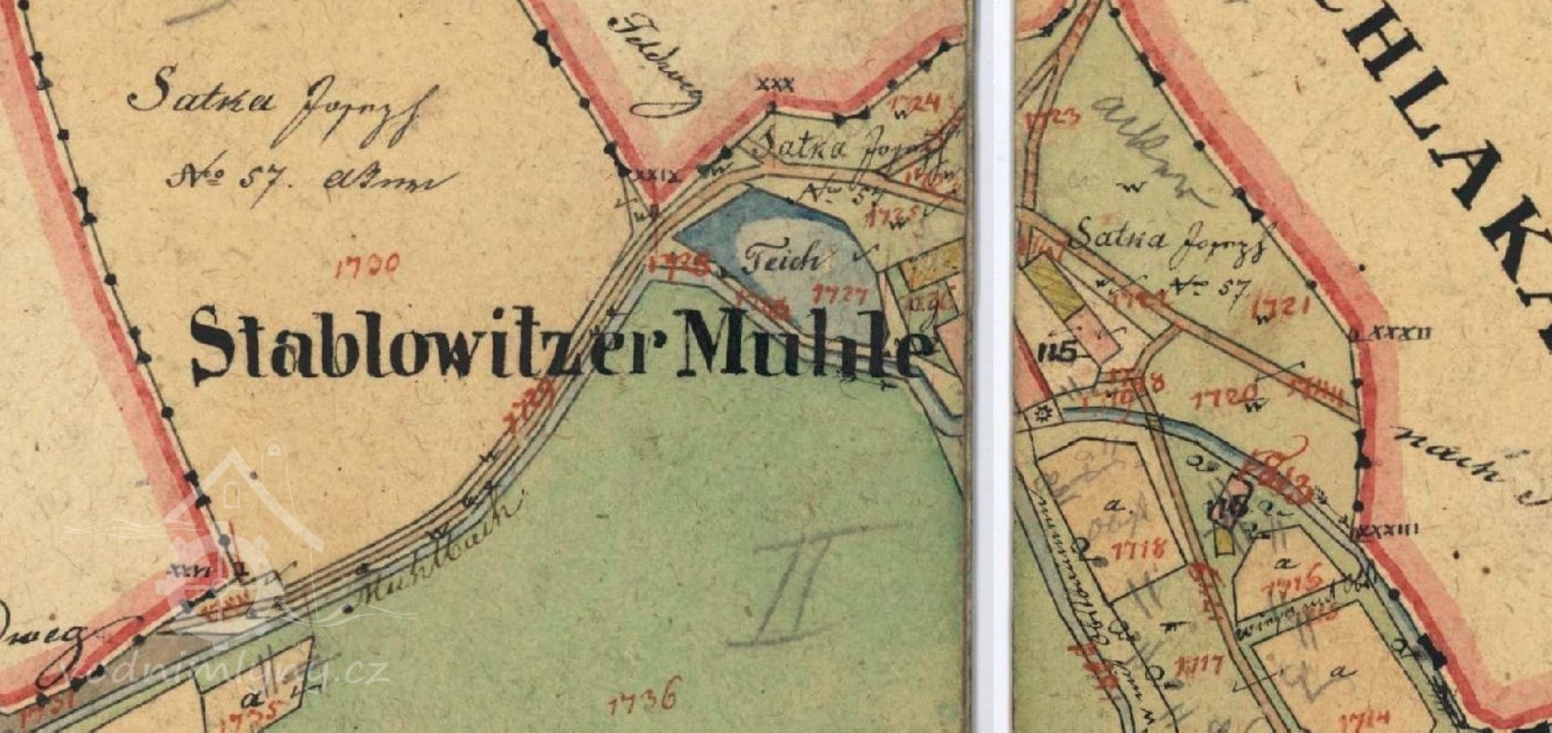 Štáblovický mlýn držela už v druhé polovině 17. století mlynářská rodina Olbrechtů. Důkaz nám o tom podává oddací matrika Hradce nad Moravicí, kde najdeme zápis, že se 17. ledna 1683 ženil Pavel, syn zemřelého Valentina Olbrechta, mlynáře ve Štáblovicích, s Marinou, dcerou zemřelého žimrovického mlynáře Jiřího Tesaře. V roce 1699 se pak zmiňuje štáblovický mlynář Ondřej Olbrecht. Podrobnější zprávy o štáblovickém mlýně máme až z gruntovních knih, ve kterých se z prvního zápisu týkajícího se mlýna ze dne 1. března 1738 dovídáme, že Jan Olbrecht koupil od svého nevlastního otce Jana Pflegera na řece Hvozdnici ležící mlýn o 2 složeních za 250