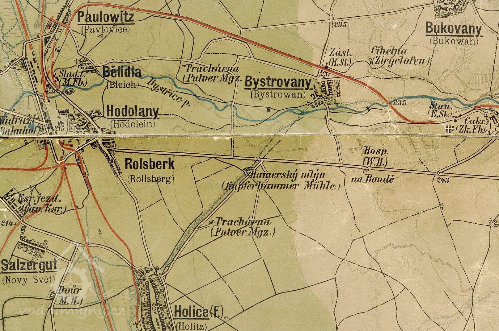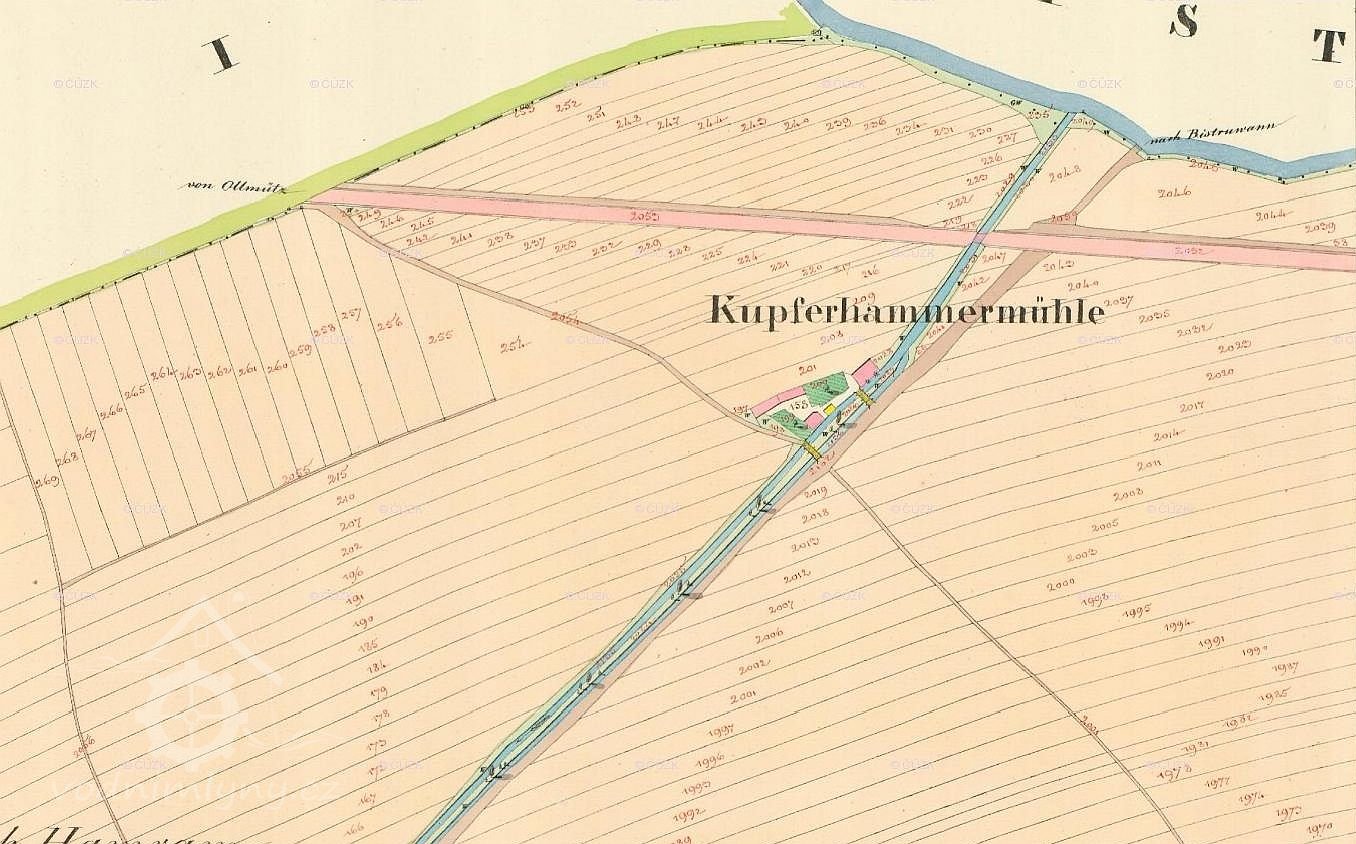 Po pravé straně dnešní silnice Olomouc-Přáslavice, u kruhového objezdu u Bystrovan, se nacházela budova bývalého obilního mlýna. Na tomto mlýně máme doložen již od 2. poloviny 16. století měděný hamr, podle kterého se mlýn nazýval také Kupferhammer Mühle neboli Hamerský mlýn (lidově též Měďárna). Ležel na umělém náhonu, který zřídilo město Olomouc v 1. polovině 16. století, když odvedlo část vody z řeky Bystřice u Bystrovan na své rybníky a mlýn v Holici.