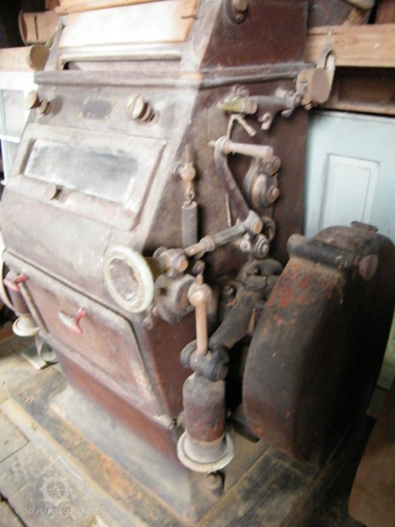 Sobáčovský mlýn - technické vybavení, 27.1.2018, © Čenda Šopek, (Prvky na obrázku: vysévač rovinný, značka výrobce na technologickém vybavení)
