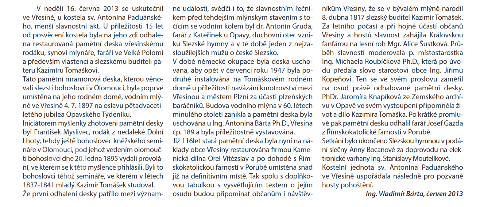9. dubnba 1817 se v mlýně narodil P. Kazimír Tomášek, básník a sběratel ,lidových písní (+ 20.4.1876 ve Velké Polomi)