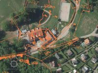 Velká obdélníková patrová mlýnice. přízemní hospodářské budovy uzavírají dvůr.