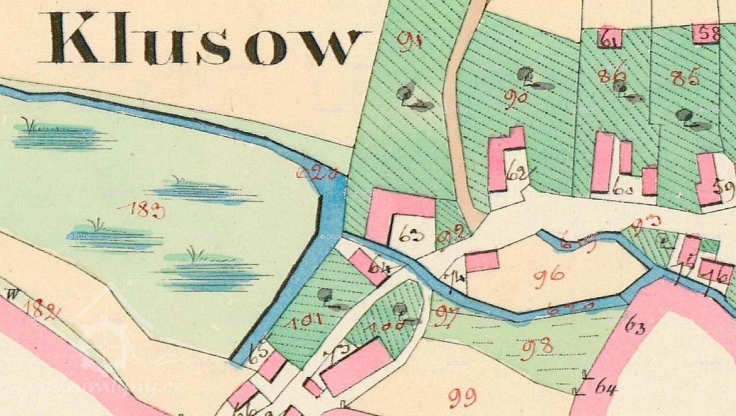 Mlýn na Kluzově, tzv. Kaděrův mlýn se nacházel uprostřed osady. Původně tato nemovitost patřila vrchnosti z Chudobína, která na mlýn dosazovala mlynáře. Na mlýně pracovalo poměrně mnoho rodinných i cizích občanů. Marie Sobrová (Navrátilová) ze Seničky zde vařila pro 16 strávníků každý den. Kromě mletí obilí sem jezdili formani pro led, který se zde vyráběl. Ten pak vozili po okolních hospodách.