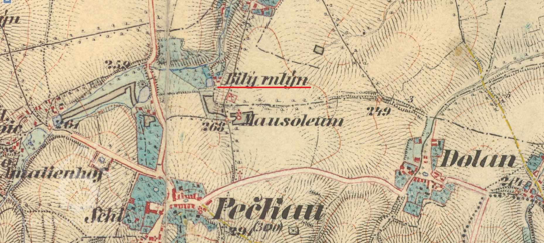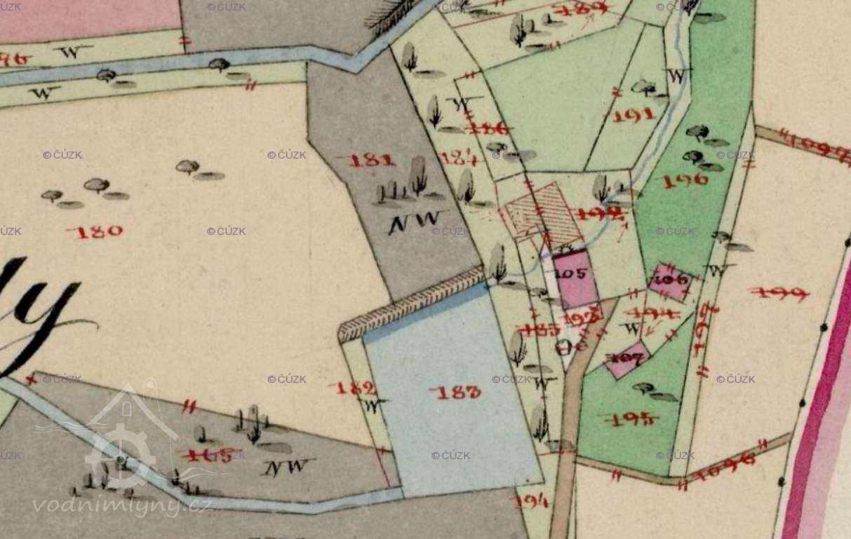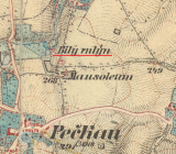 Zaniklý mlýn s pilou mezi Červenými Pečkami a Nebovidy. Na místě mlýna dnes stojí čistička.