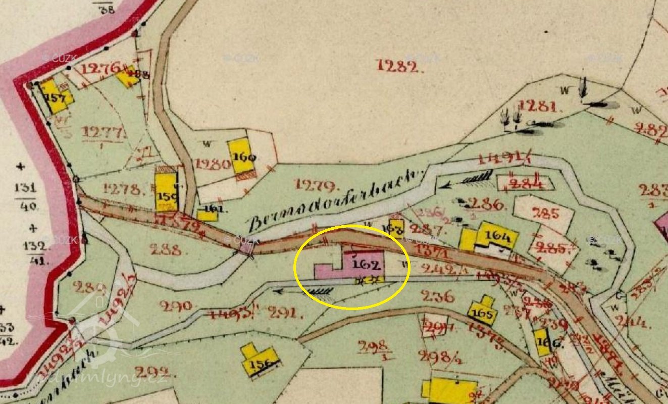 PopisV r. 1930 zde bylo 1 kolo na svrchní vodu, průtok 0,091 m3/s, spád 4,4 m, výkon 3,5 k.