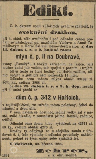 V následujících letech mlýn často měnil majitele, ale vždy pouze se souhlasem vrchnosti. V polovině 19.století náležel mlýn Leopoldu Duškovi, který nechal vlastním nákladem vystavět silnici ke křižovatce u budoucí restaurace Doubravka (N 50 22.070 E 015 38.860). Mlýn byl v té době přízemní a patřila k němu i pila využívající vodní síly. Následujícím majitelem se stal známý hořický podnikatel Václav Tomášek, který mlýn zvelebil, přistavěl první patro a provoz vybavil parním strojem, který nahradil vodní sílu v obdobích sucha. Nástupci pana Tomáška Janu Vintrovi se příliš nedařilo a po jeho smrti v roce 1900 mlýn prodala mlynářova vdova v dobrovolné dražbě.