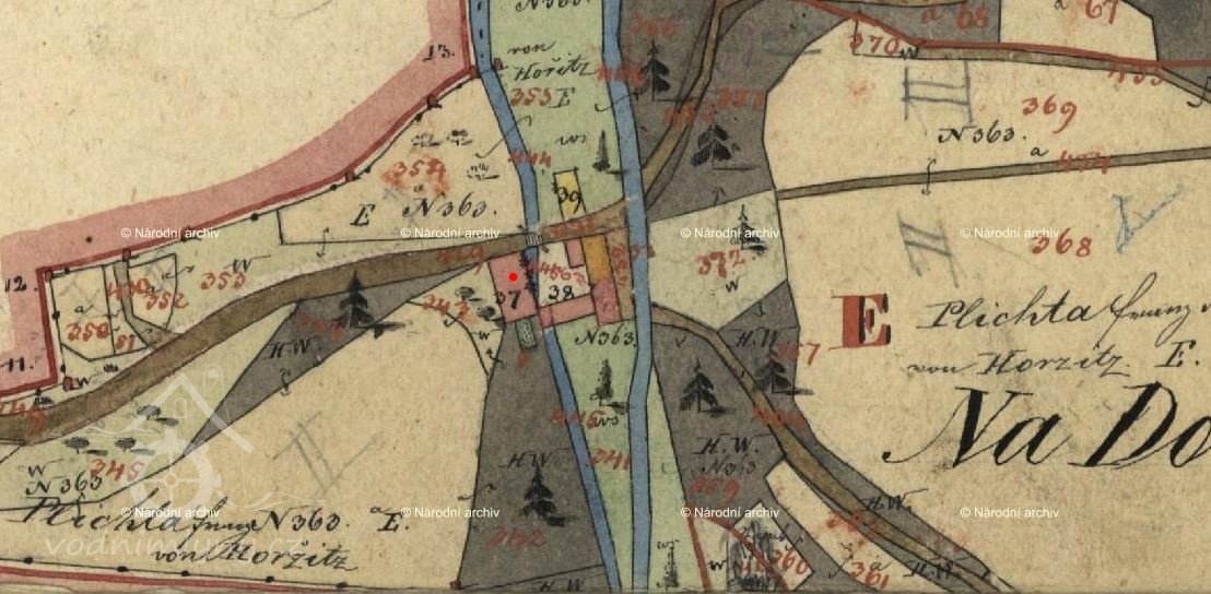 Panský mlýn je zmiňován již v inventáři panství Smiřických z roku 1611. Mlýn zůstával ve vlastnictví majitel hořického panství až do roku 1748, kdy byl prodán za 1500 zlatých Josefu Rykrovi z Hořic. Nový majitel se v kupní smlouvě mimo jiné zavázal semlít určité množství obilí pro vrchnostenské úředníky a dvorskou čeleď. Od nejstarších dob byli k tomuto mlýnu přiděleni „mleči“ – hořičtí pekaři a obyvatelé vsí Doubrava, Dobeš a Chvalina, kteří měli být obslouženi „spravedlivě a bez šizuňku“. Nový mlynář se dále zavázal, že nebude kupovat a mlít kradené obilí, nebude chránit zloděje ani přechovávat bludné kacíře.