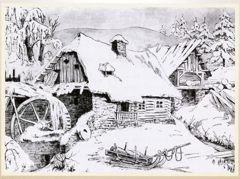 "Je to bývalý, skutečný mlýn v Trojanovicích. Jeho majitel byl kdysi nějaký Kocián a říkalu mu 'Pepisu'. Jeho syn se na kunčické pouti, kde bývalo vždy veselo, seznámil s nějakým člověkem a pozorovali obchodníka, který o pouti vydělal hodně peněz. Nenápadně ho sledovali, v lese pak přepadli, oloupili a zabili. Po cizím člověku se slehla zem. Kociánův syn byl však vypátrán a pro vraždu odsouzen na doživotí. Nebylo nástupce mlynářova, mlýn chátral, oněmělo mlýnské kolo a vítr trhal došky ze střechy. Zůstalo jen to, co se mně podařilo perem a štětcem zachytit."