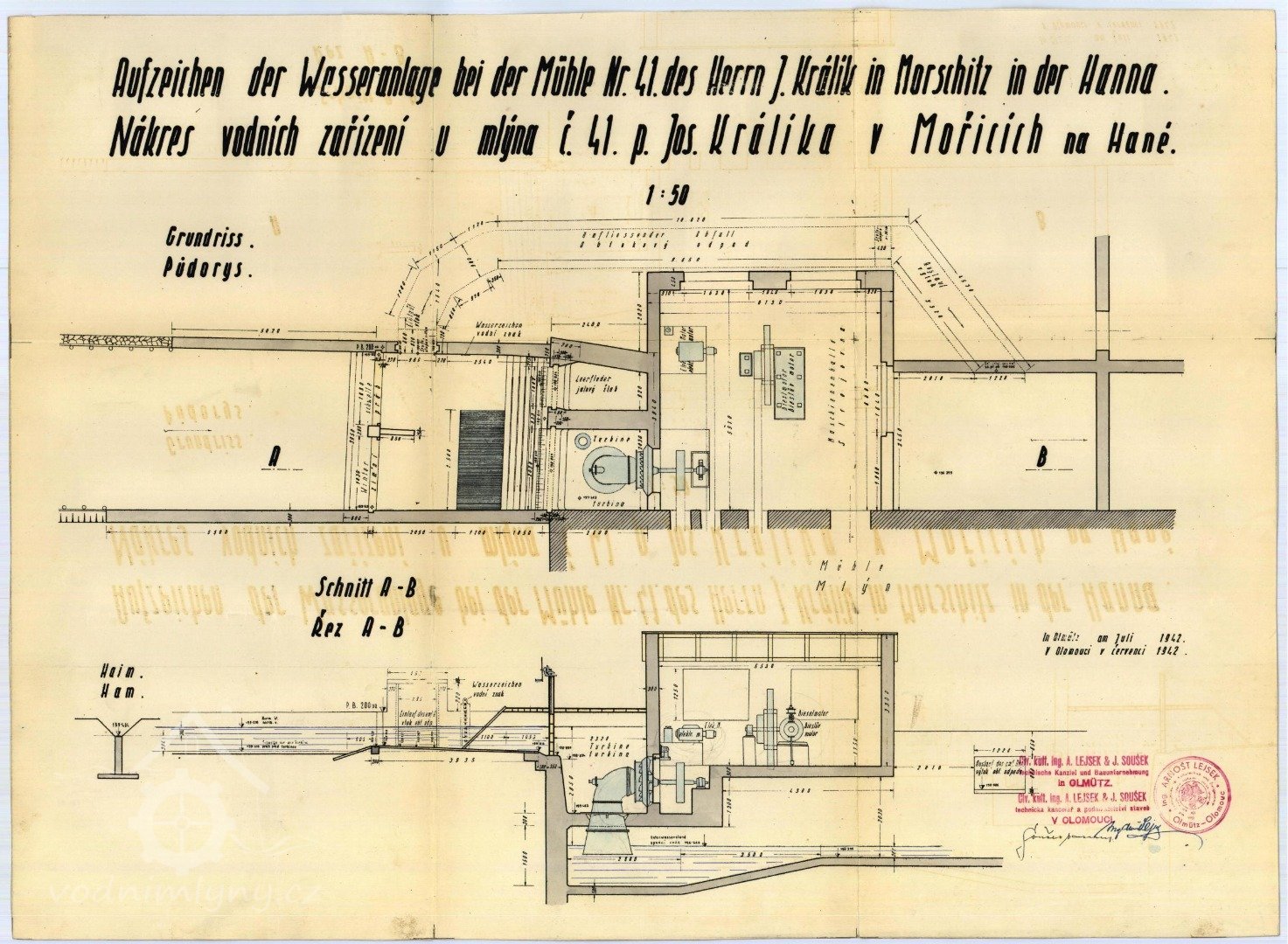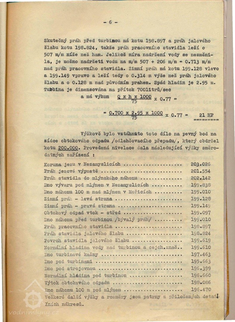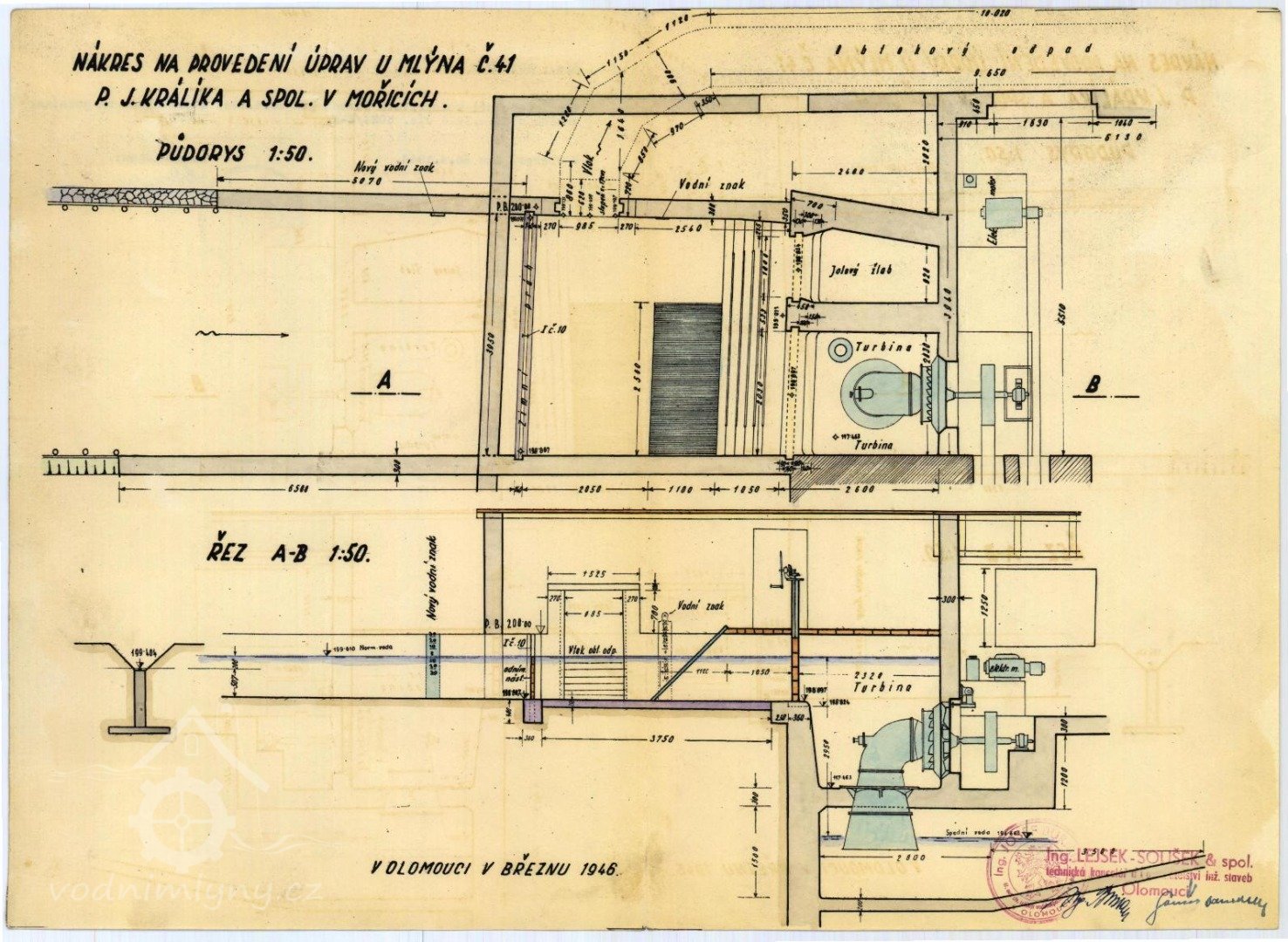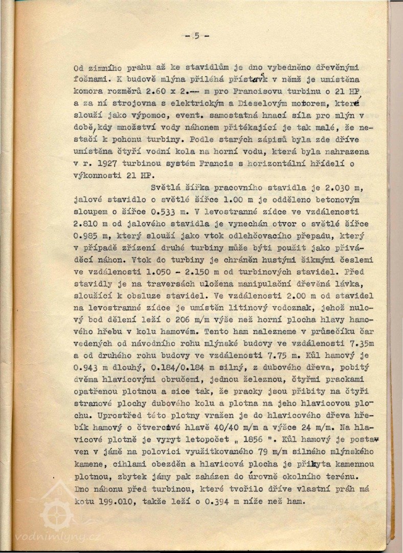 1930: 1 turbína Francis, hltnost 0,51 m3/s, spád 2,95 m, výkon 15,5 HP