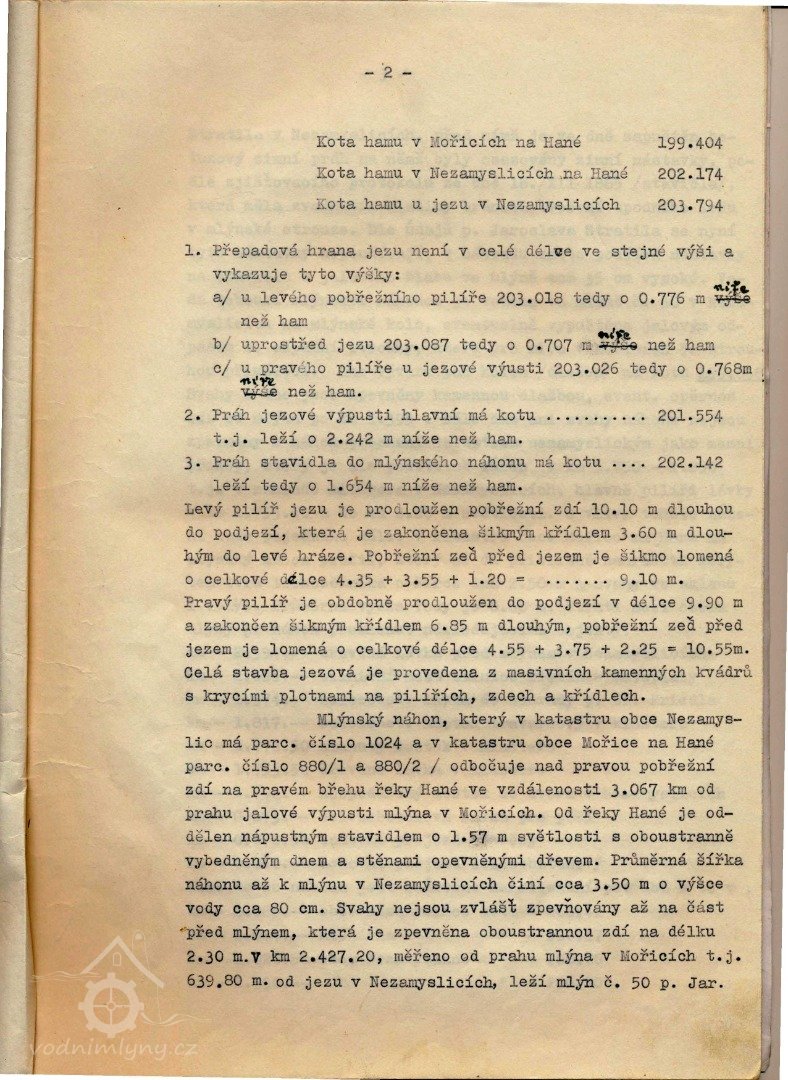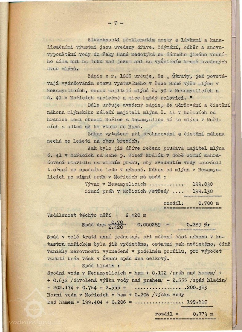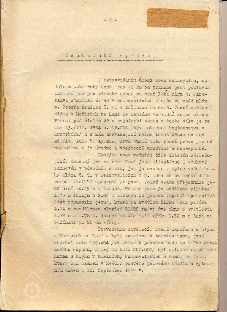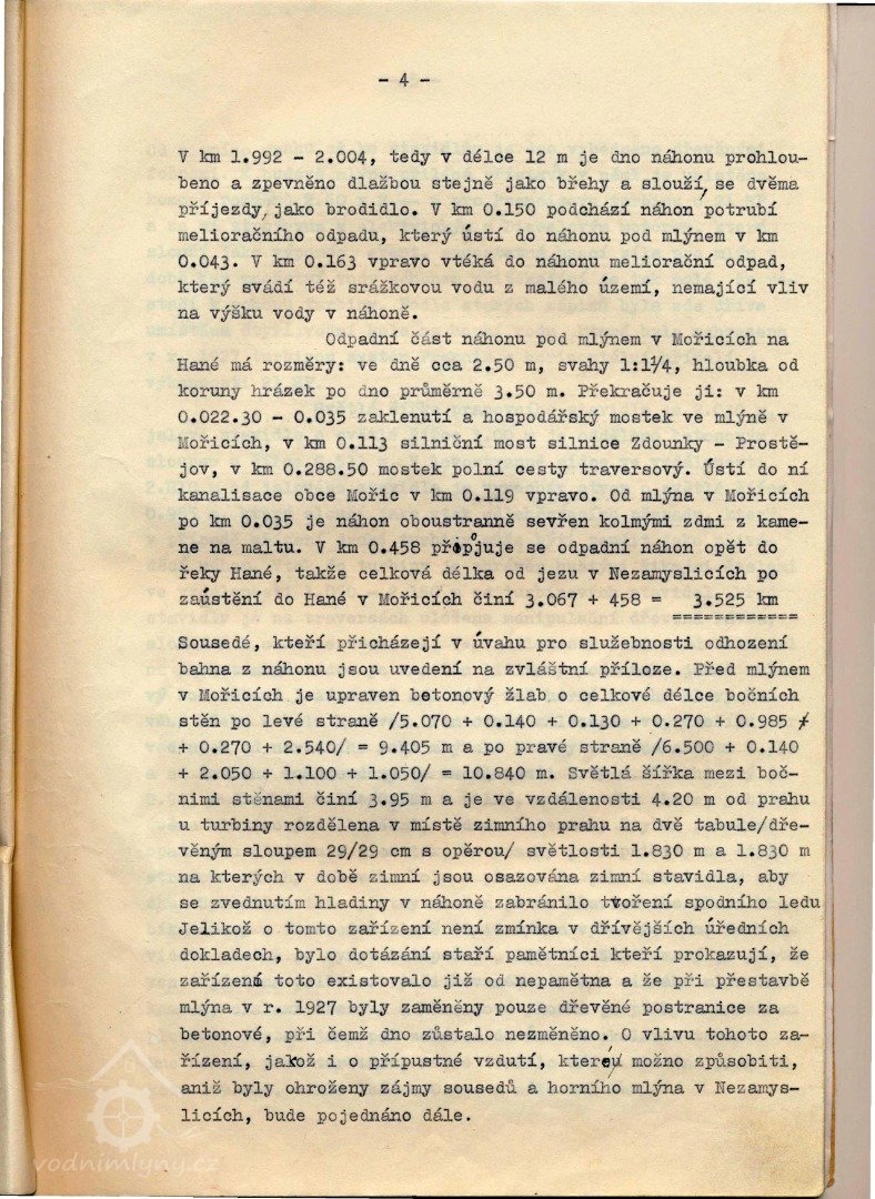 1930: 1 turbína Francis, hltnost 0,51 m3/s, spád 2,95 m, výkon 15,5 HP