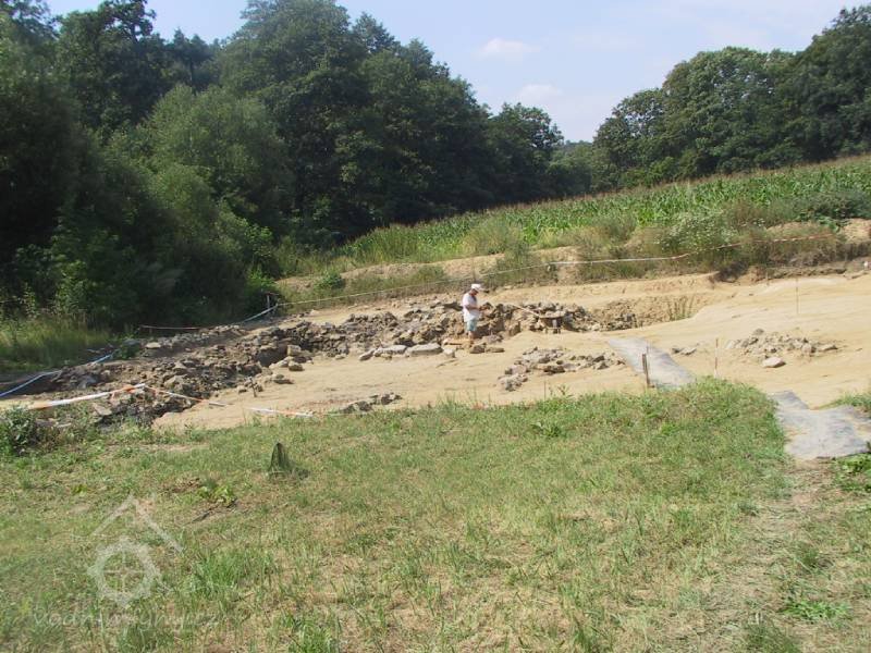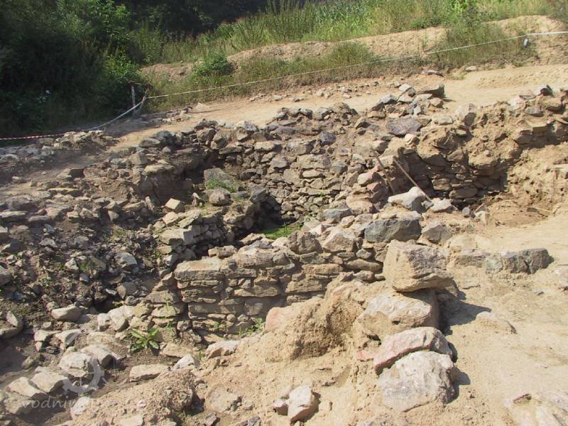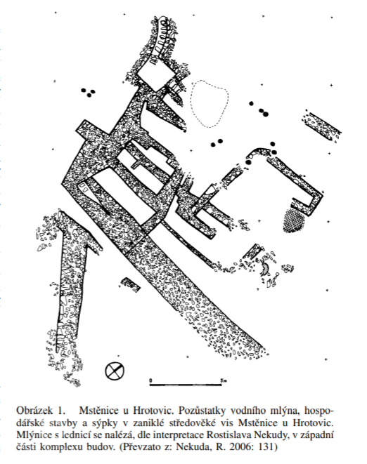 Mnoholetý vědecký výzkum odhalil zaniklou středověkou ves Mstěnice a s největší pravděpodobností i vodní mlýn ze 14. století, ležící u Hrotovic na jižní Moravě. V letech 1997–1999 probíhal geofyzikální průzkum vsi, který měl mimo jiné upřesnit polohu mlýna na Mlýnském potoce, zachyceného písemnými prameny k roku 1407 do roku 1466 (Nekuda 1998: 219–220; Nekuda 2001: 139–140). Od roku 1999 byl v místech předpokládané stavby na vodní pohon zahájen archeologický odkryv, který zaznamenal lícované zdivo dvou prostor, jež bylo součástí většího stavebního celku, poté fragmenty mlecích kamenů, kůlové jamky a topeniště (Nekuda 2001: 140–142). V dalších sezonách odkryv pokračoval. Výzkumem byl zjištěn komplex staveb rozkládajících se na západním konci vesnice na potoku, v ploše 400 m2. Zásobu vody pro provoz mlýna zajišťoval přibližně 100 metrů vzdálený rybník, zbudovaný na Mlýnském potoce. Jednalo se tedy o mlýn na nestálé vodě, nejpravděpodobněji na horní vodu. Na východní straně komplexu staveb stál obytný dům o rozměrech 11 x 6 m, který se členil na jizbu s pecí a komoru. Tyto prostory byly přístupné ze dvora, přičemž jizba měla další vchod na jižní straně k mlýnici. Na západní straně se nacházela dvoupatrová kamenná mlýnice, členěná do dvou místností o rozměrech 5 x 1,5 m a 4 x 2 m s dosaženou hloubkou 2,2 m. V blízkosti mlýna se nalézal ještě patrový špýchar o vnějších rozměrech 3,7 x 3,1 m a vnitřních rozměrech 2 x 5 x 2 m (Nekuda 2001: 142–143); (obr. 1). V dochovaném suterénním zdivu do výšky 2,2 m byly zjištěny dva vstupní otvory, přičemž vchod ze dvora se v průběhu doby zazdil. Tato situace by mohla být dána do souvislosti s přítomností starší konstrukce zjištěné v prostoru vlastní mlýnice, která by značila přestavbu mlýnského díla (Nekuda 2006: 128: 133: 138: 139; Nekuda 2001: 141–146). Na stavbu komplexu budov byl užit hadec a migmatizované ruly získané z blízkého okolí vsi (Přichystal 2005: 199–200). V prostoru odkrytého komplexu vodního mlýna byly roztroušeny fragmenty mlýnských kamenů. Kamenné brusy, mlecí kameny a moždíř byly zhotoveny z arkóny a slepence z Boskovické brázdy, dále z bílých křemenných a červených slepenců. Tyto horniny, transportované ze Znojemska či Tišnovska se cenily z důvodu vyšší odolnosti vůči obrusu, i přes obtížnější opracovatelnost (Přichystal 2001: 164–165; Přichystal 2005: 198–199). Objekt zanikl ve druhé polovině 15. století společně se vsí, v důsledku válečných událostí (Nekuda 1985: 183; Nekuda – Nekuda 1997: 89; Historický ústav 2005: 704). Autor: Lucie Galusová