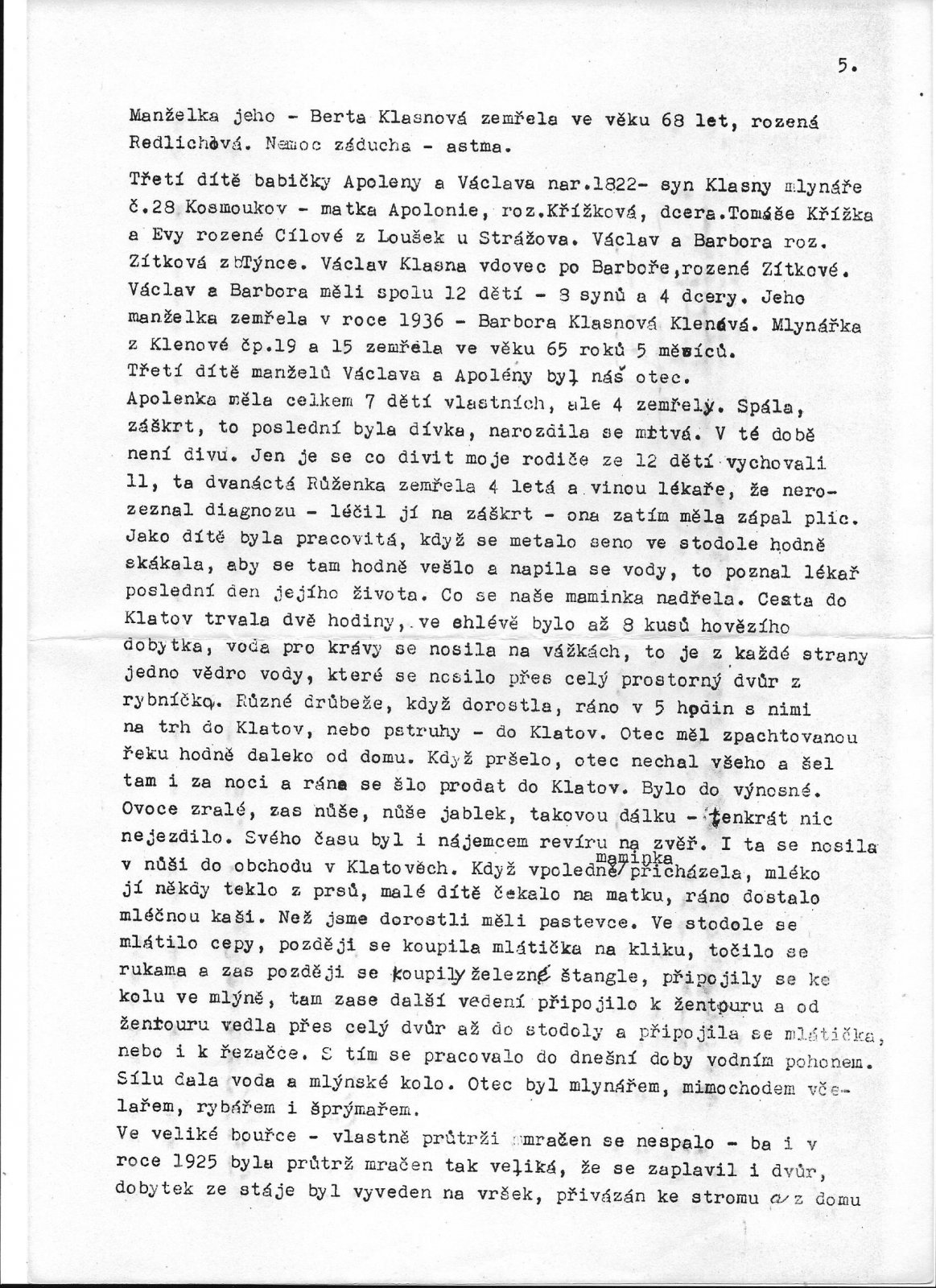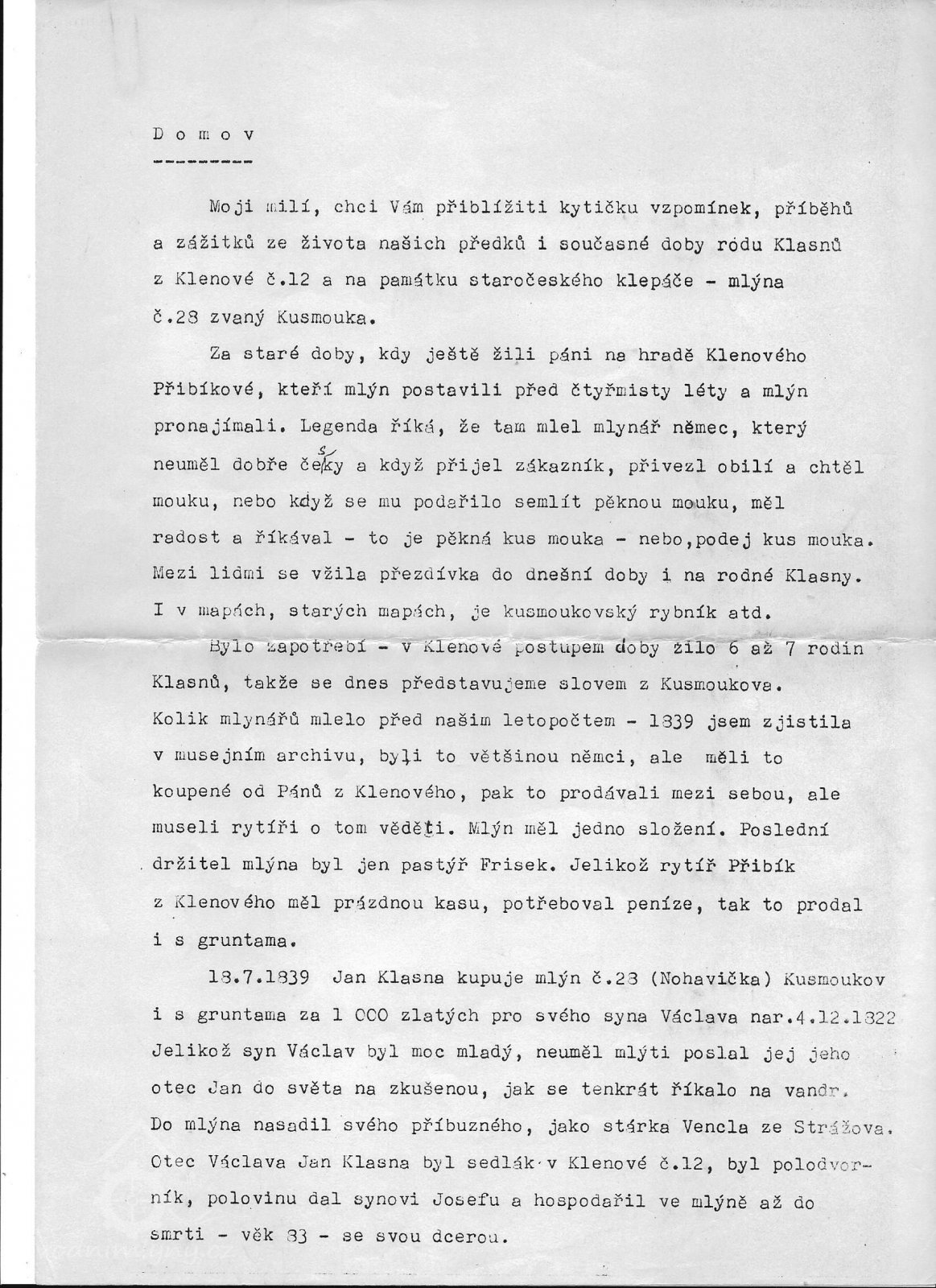 18.7.1839 za 1000 zl. zakoupil Jan Klasna, sedlák z Klenové č. 12, pro syna Václava (4.12.1822-1891). Jelikož Václav nebyl vyučen, poslal jej otec do světa a mlýn zatím spravoval stárek Vencl ze Strážova. Václav byl 3x ženat, 1.manželka Marie Altmanová z Týnce (+1851), 2. manž. Kateřina Jandová z Klenové (1817-1859), 3.manž. Apolonie Křížková z Loužku u Strážova (1837-1918).