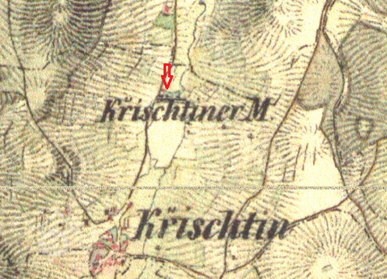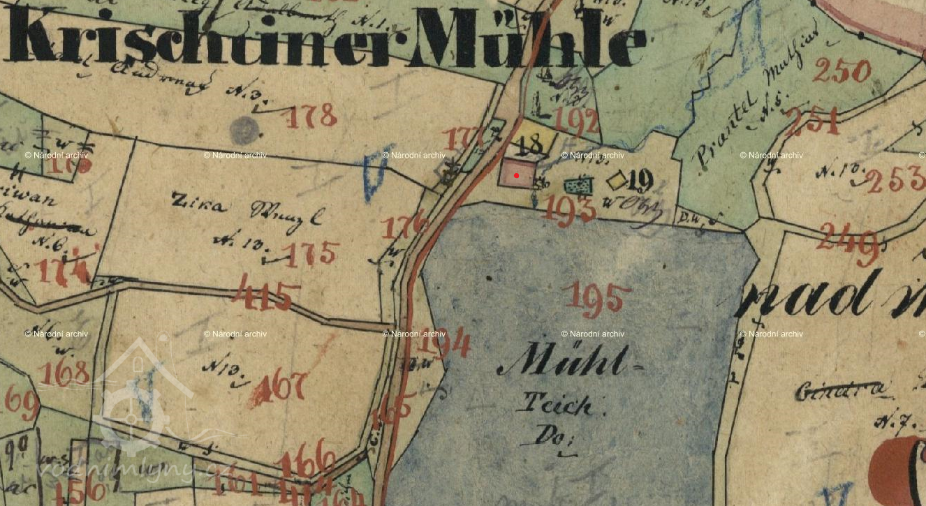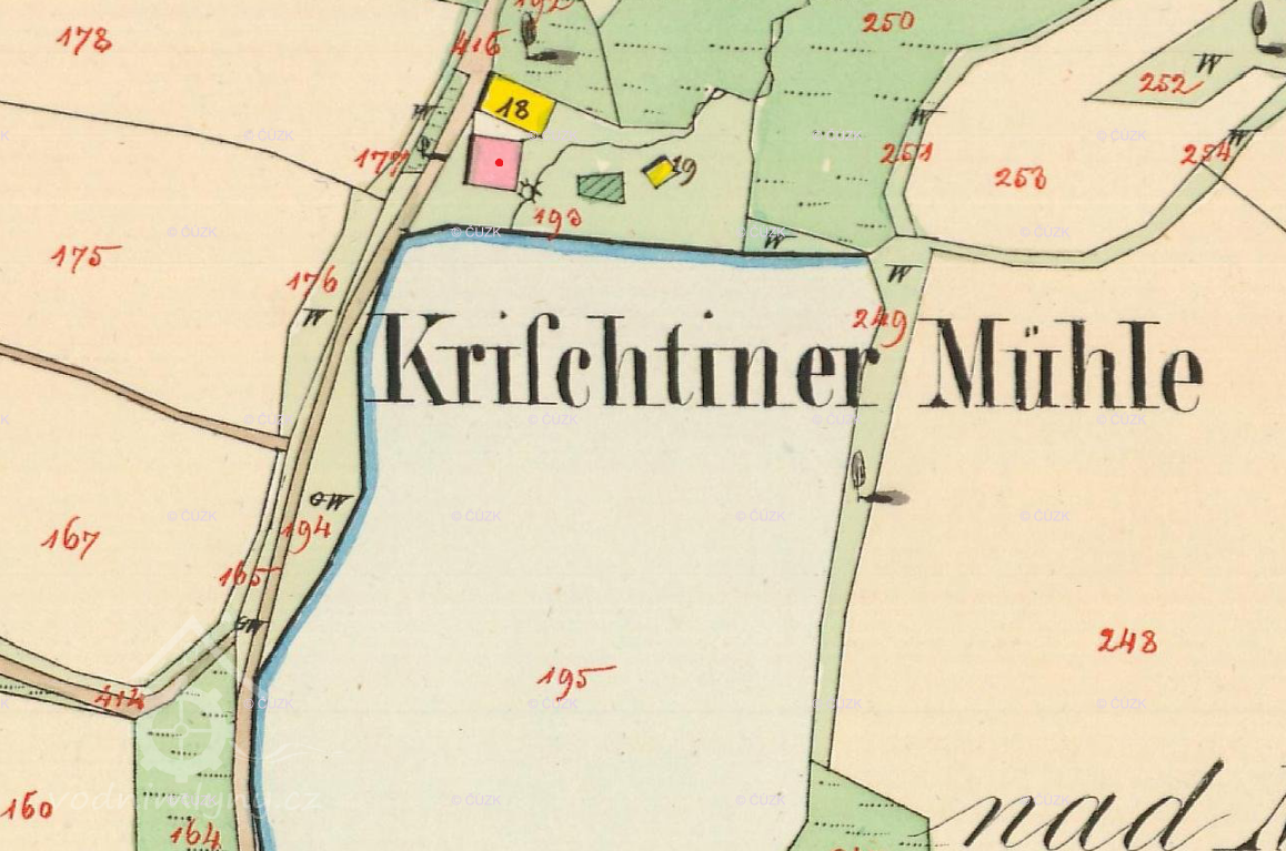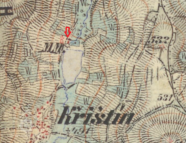 Jednalo se o samotu- mlýn čp.13/st.p.18 v katastrálním území Křištín.Nemovitost je zobrazena na mapě Stabilního katastru:Čechy-3652-1,mapový list č.002.K usedlosti patřila ještě kolna /st.p.19 a pozemkové parcely.