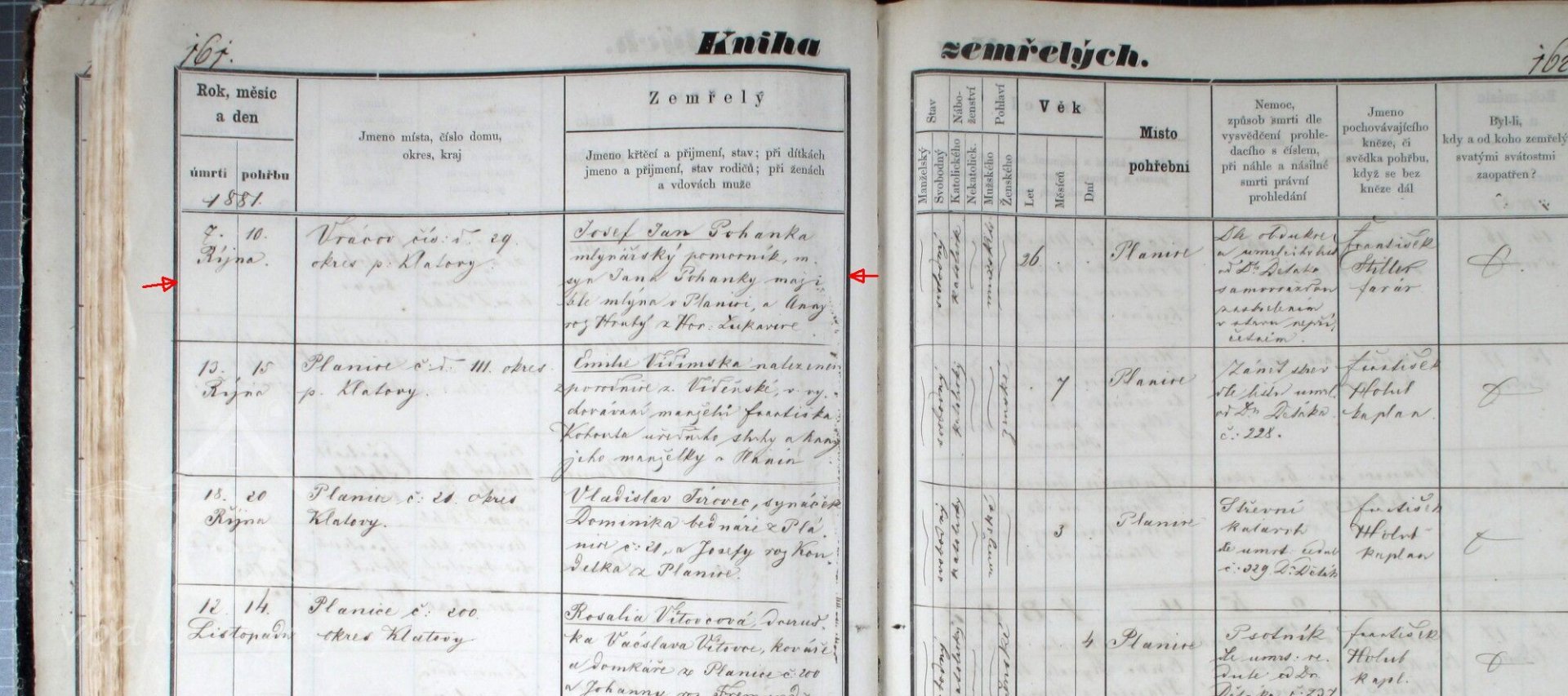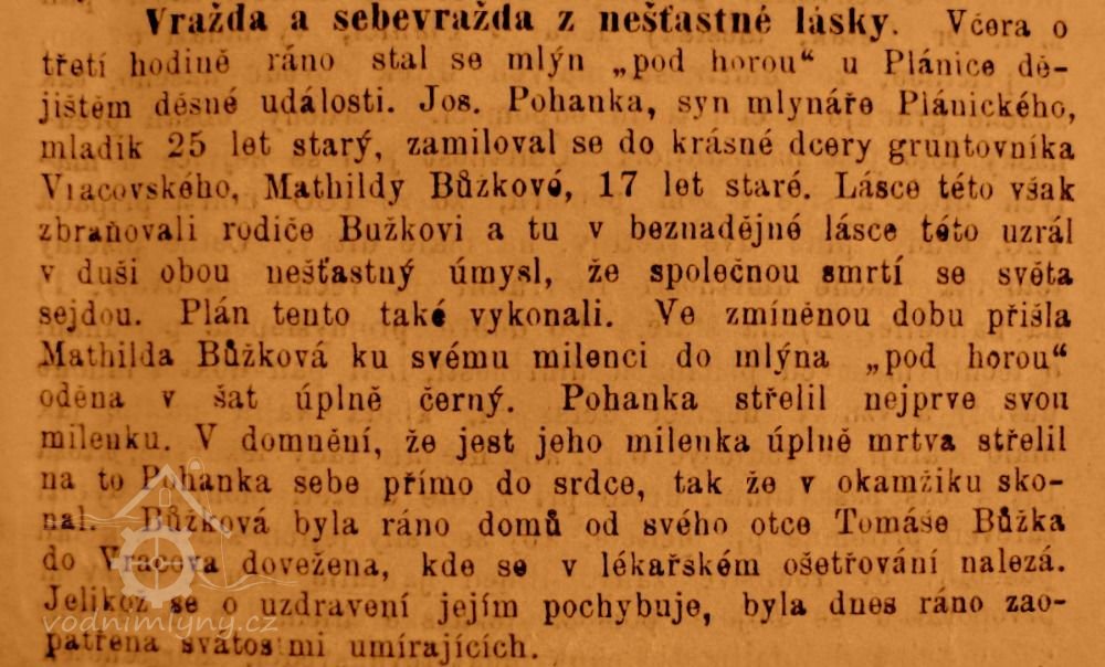 7.10.1881 se zastřelil Josef Jan Pohanka, syn plánického mlynáře Jana, z nešťastné lásky, věk 25 let (vizl literatura a foto) HŠ