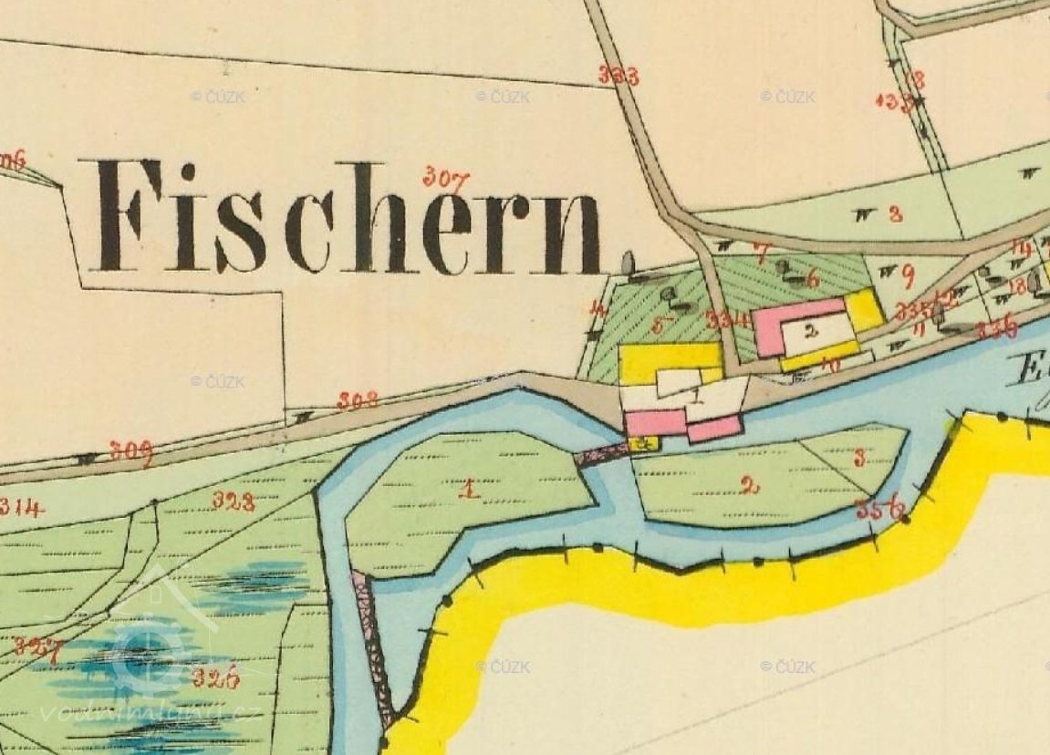 Obec Fischern, zmíněná r.1300, je řekou Ohře rozdělená na dvě obce. Jedna se nachází na české straně a druhá na bavorské straně. Toto rozdělení bylo politicky rešeno r. 1322.