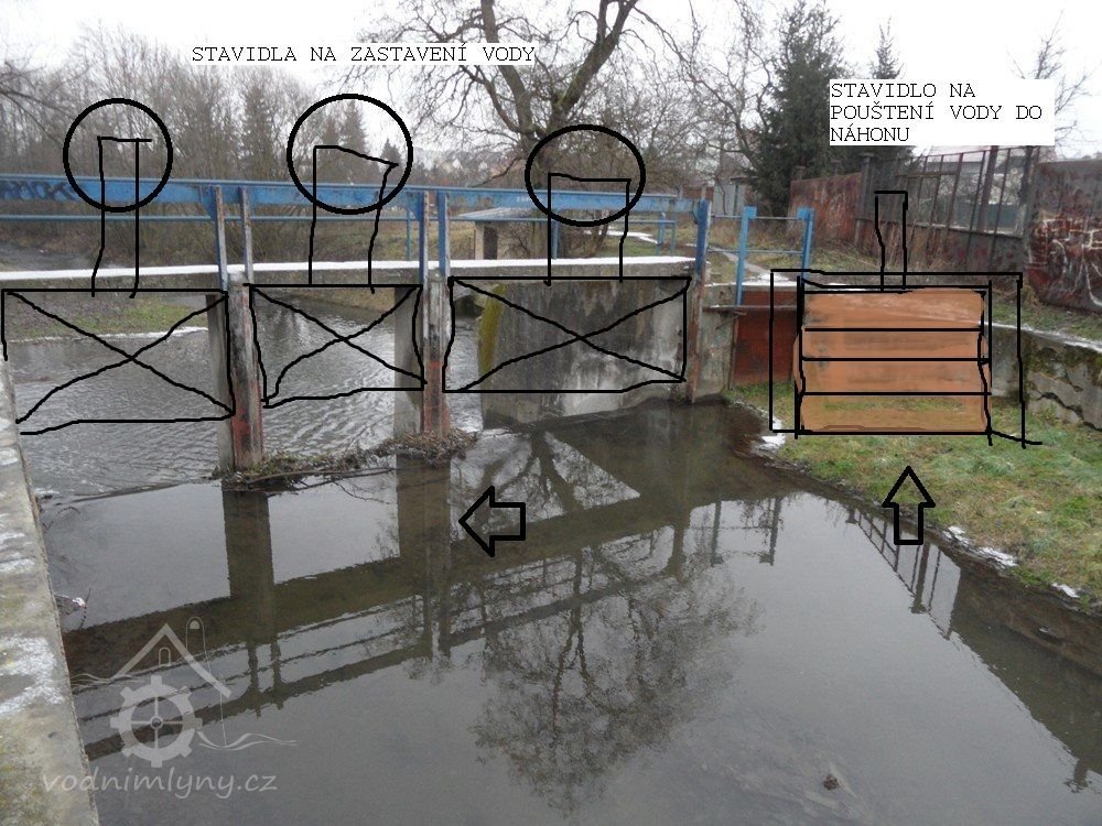 Náhon začínal na splavu asi 100 od mlýna a pokračoval dál na Trávnický (Joklův) mlýn.